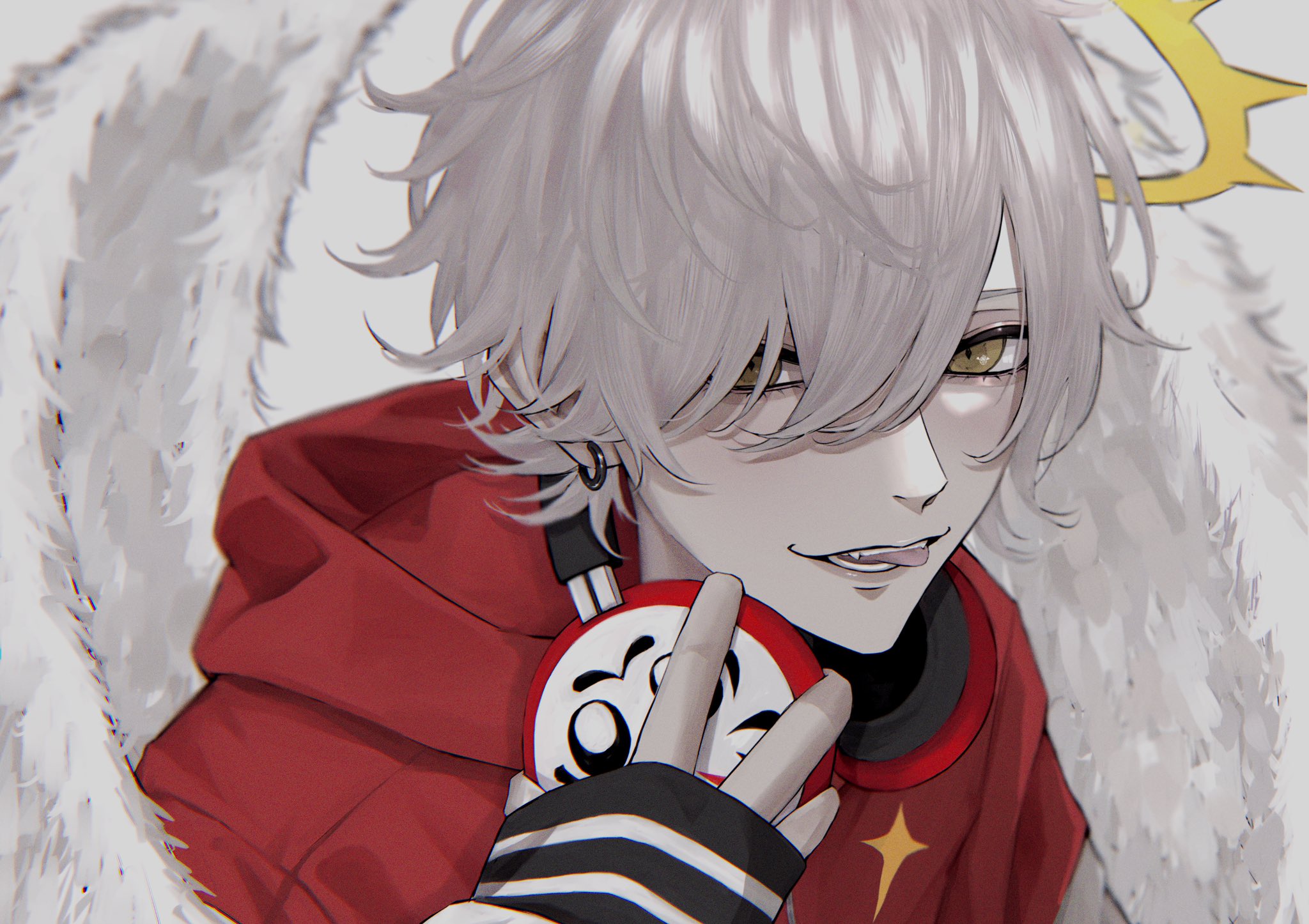 1boy avanokabeuch crazy_raccoon daruma_is_god earrings feathered_wings hair_between_eyes halo headphones highres holding holding_headphones hood hood_down hoodie jewelry male_focus portrait red_hoodie solo tongue tongue_out white_hair wings yellow_eyes