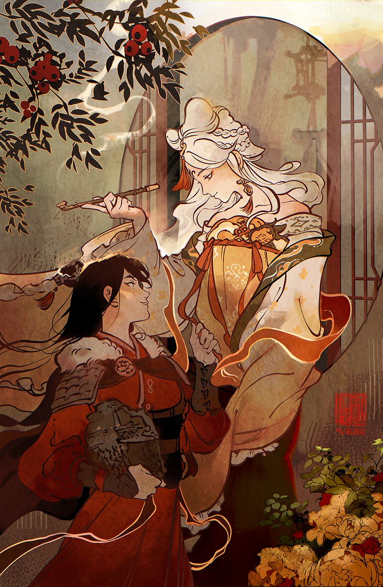 2girls arm_guards bare_shoulders beidou_(genshin_impact) black_hair bow-shaped_hair braid branch cape chinese_clothes closed_eyes closed_mouth coat commentary couple dress earrings english_commentary eyeliner facial_mark floating_hair flower forehead_mark fur_trim genshin_impact hair_bun hair_ornament half_updo hand_up hanfu helmet highres holding holding_unworn_helmet holding_ribbon jewelry kiseru logo long_sleeves looking_down looking_up makeup multiple_girls ningguang_(genshin_impact) off_shoulder open_window outdoors outstretched_arm profile puffy_long_sleeves puffy_sleeves qixiong_ruqun red_cape red_flower red_ribbon red_robe ribbon robe round_window sash shawl single_hair_bun sleeves_past_fingers sleeves_past_wrists smile smoke smoking smoking_pipe tassel tassel_hair_ornament through_window unworn_headwear unworn_helmet upper_body velinxi white_hair window yellow_dress yuri