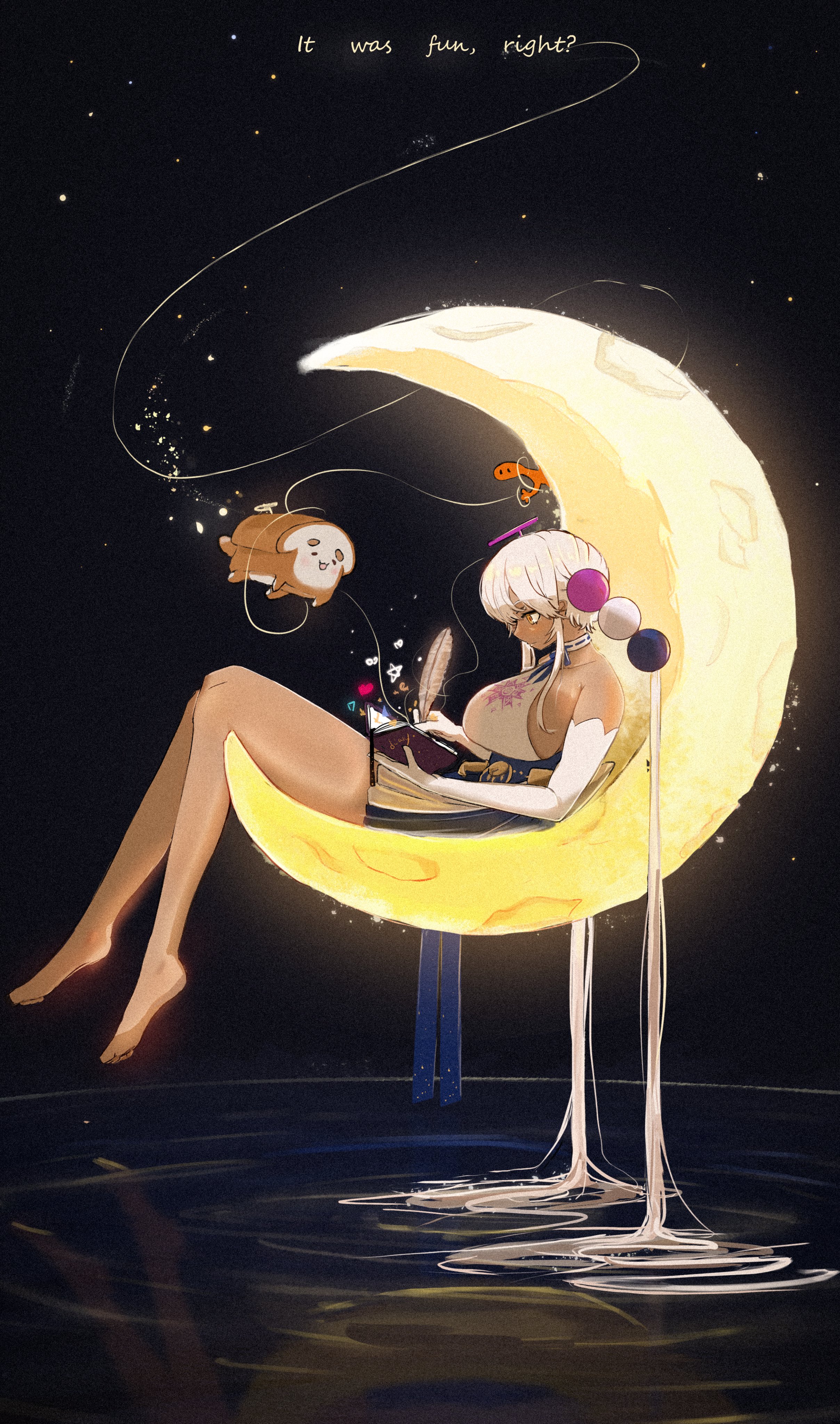 1girl absurdres blonde_hair breasts crescent_moon dark-skinned_female dark_skin diary elbow_gloves gloves hair_ornament highres hololive hololive_english limiter_(tsukumo_sana) long_hair moon nereb_72 night quill ripples sanallite_(tsukumo_sana) sky star_(sky) starry_sky tsukumo_sana tsukumo_sana_(1st_costume) twintails virtual_youtuber yatagarasu_(tsukumo_sana) yellow_eyes