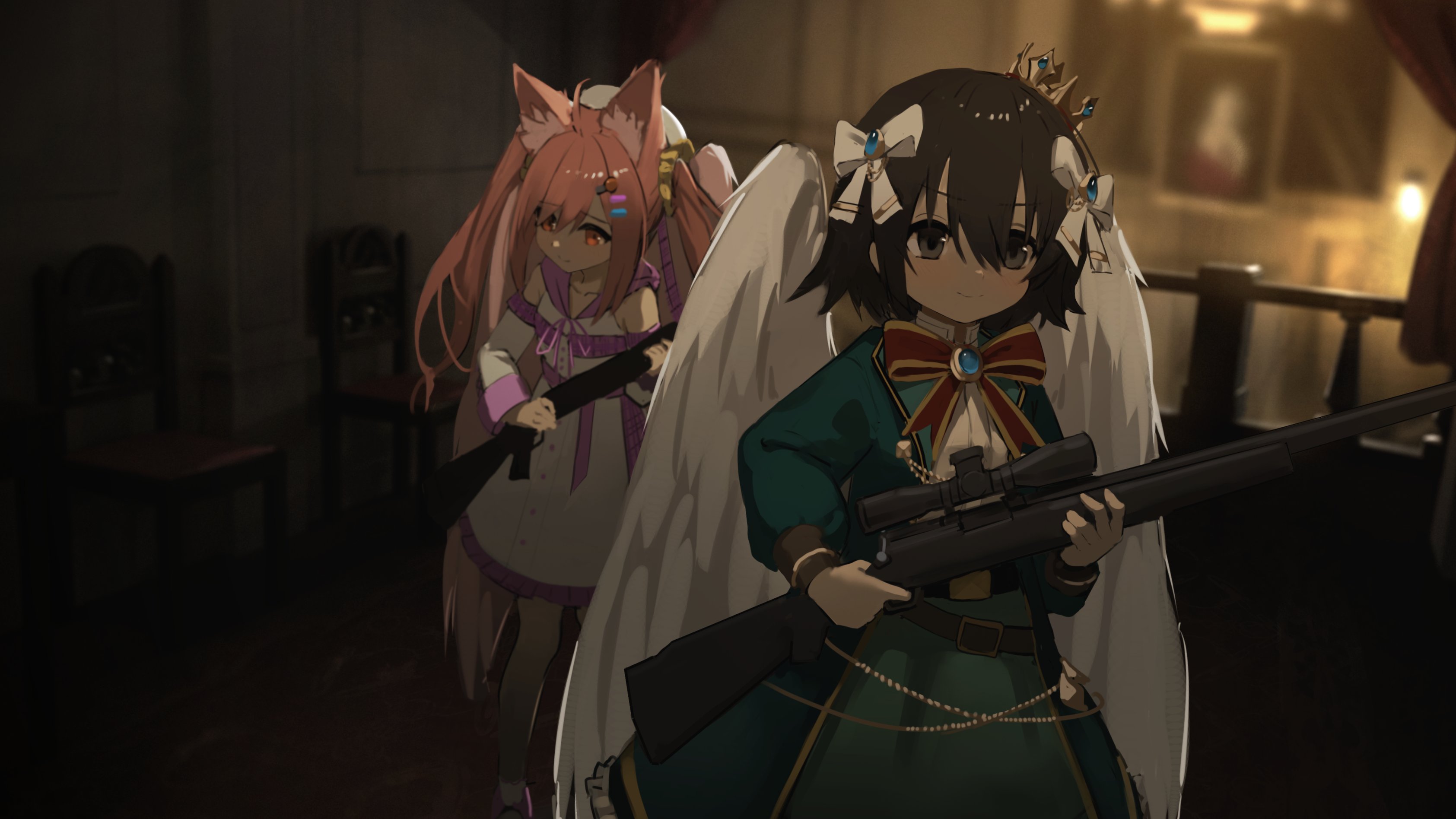 2girls absurdres ahoge angel_wings animal_ear_fluff animal_ears bare_shoulders black_hair blue_gem blurry blurry_background blush bow brown_hair chair check_copyright closed_mouth collarbone commission copyright_request curtains detached_sleeves dress female_focus frilled_dress frills gem green_dress grey_eyes gun hair_between_eyes hair_bow hair_ornament hairclip hara_shoutarou highres holding holding_gun holding_weapon indoors long_hair multicolored_hair multiple_girls orange_eyes original portrait_(object) purple_footwear purple_ribbon red_bow ribbon scope short_hair skeb_commission smile twintails two-tone_hair very_long_hair weapon white_bow wings