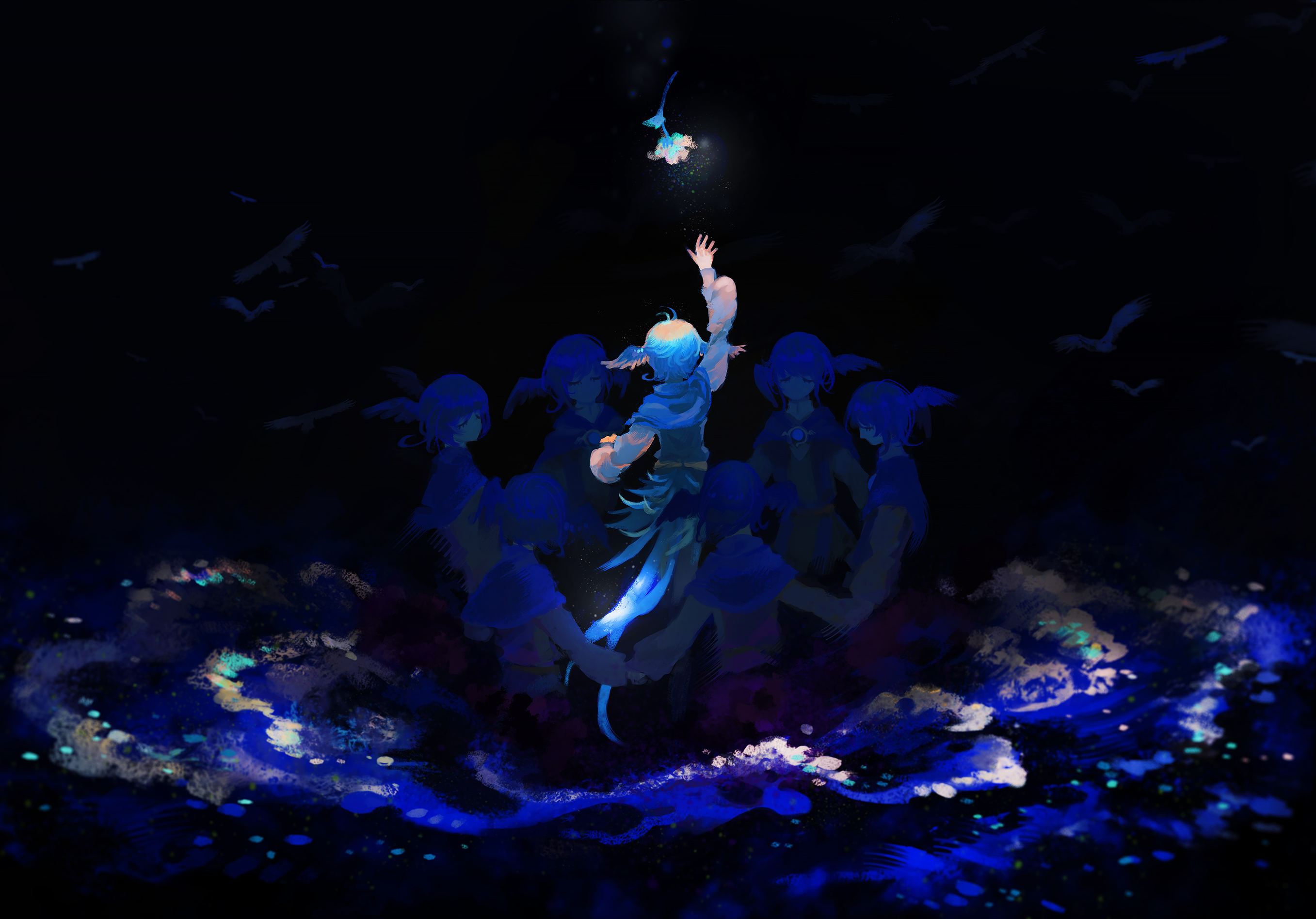 6+girls antenna_hair arm_up bird bird_girl bird_tail bird_wings black_background blue_capelet blue_hair brooch capelet catching circle_formation commentary dark english_commentary closed_eyes facing_away falling feathered_wings final_fantasy final_fantasy_xiv flower from_behind full_body glowing glowing_flower head_wings highres holding_hands jewelry long_sleeves meteion multiple_girls multiple_persona no_mouth short_hair shuumatsu_(lulux_woodoo) spoilers standing tail wings