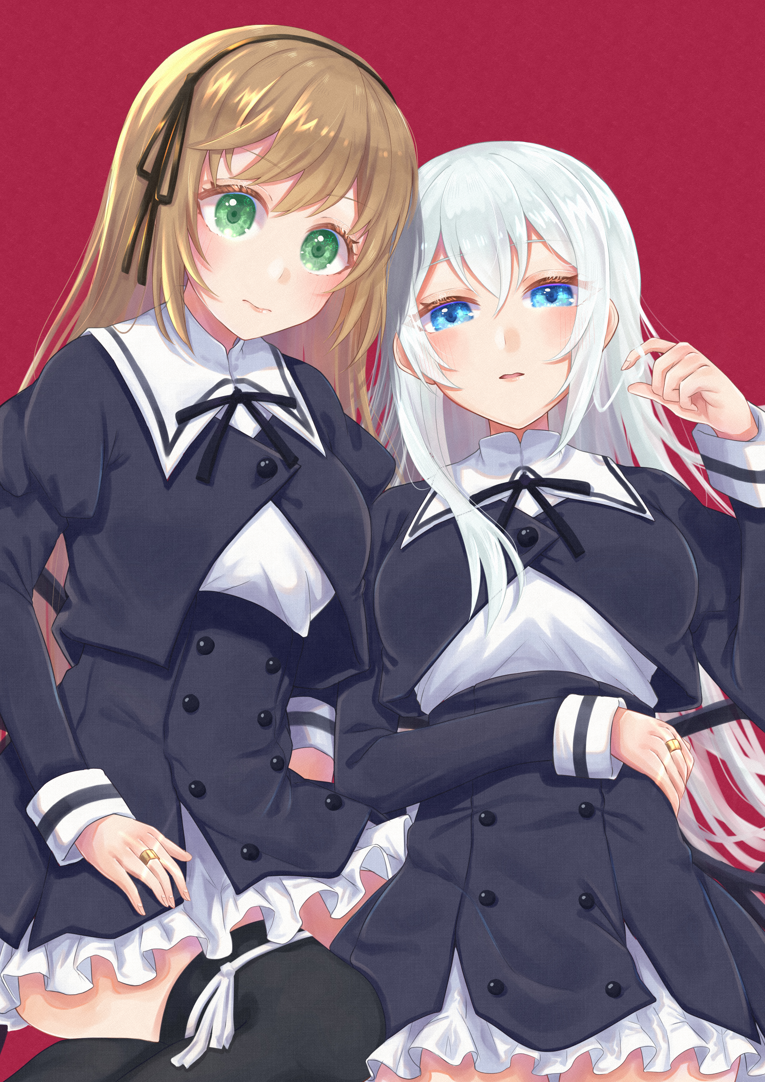 2girls absurdres arm_across_waist assault_lily black_hairband black_ribbon black_skirt black_thighhighs blue_eyes bow_hairband breasts buttons closed_mouth cowboy_shot cropped_jacket fingernails frilled_skirt frills glint green_eyes hair_between_eyes hair_ribbon twirling_hair hairband half-closed_eyes hand_up high-waist_skirt highres jewelry juliet_sleeves leg_ribbon light_brown_hair long_hair long_sleeves looking_at_viewer lying medium_breasts miniskirt multiple_girls neck_ribbon on_back on_side parted_lips puffy_sleeves red_background ribbon ring rosalinde_friedegunde_von_otto school_uniform shirt side-by-side sidelocks simple_background skirt tamura_nagi thigh_ribbon thighhighs white_hair white_ribbon white_shirt yozakurayuyu yurigaoka_girls_academy_school_uniform
