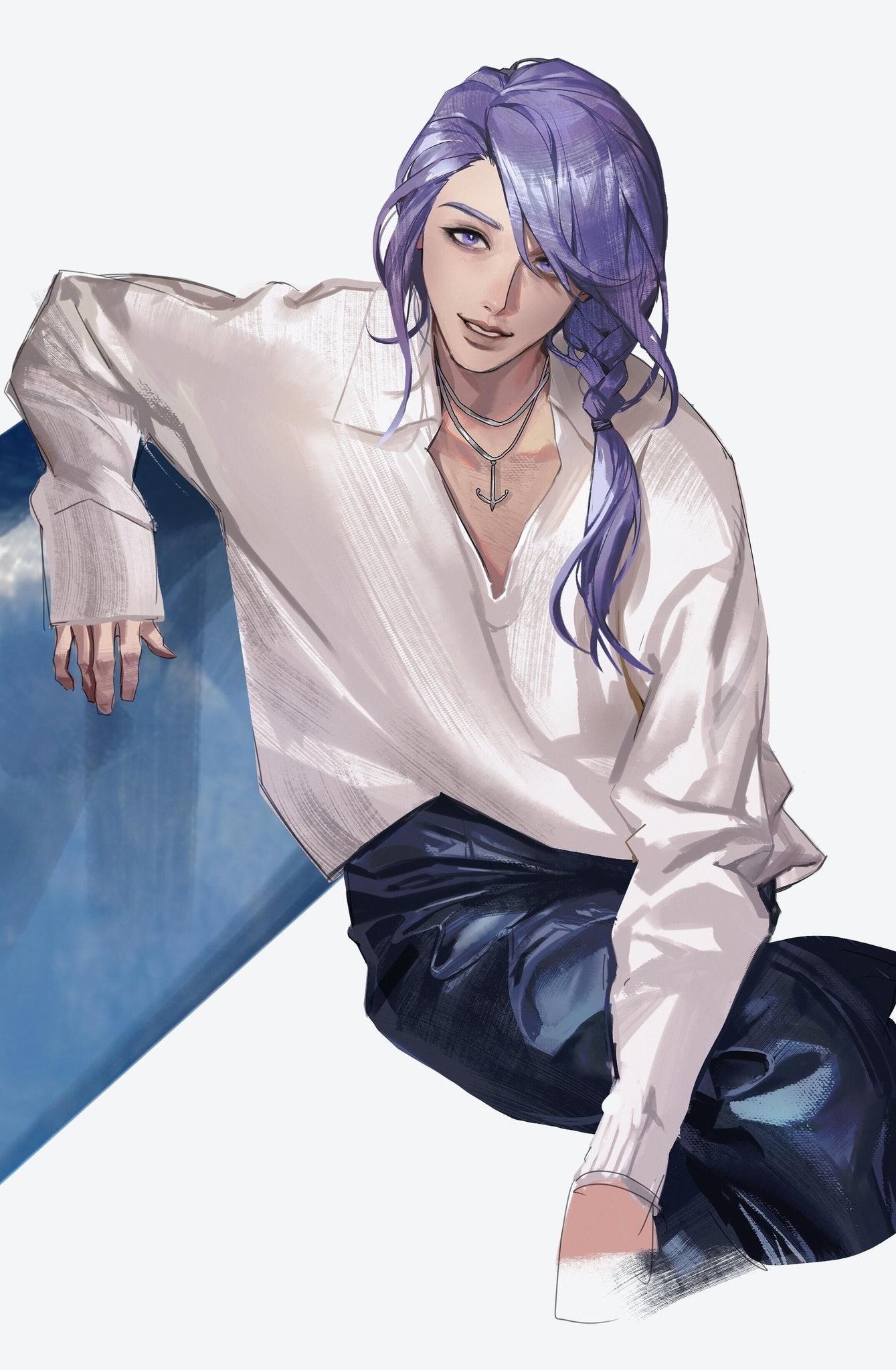 1boy alternate_costume anchor_necklace arm_rest bishounen black_pants braid chinese_commentary collarbone collared_shirt commentary_request contemporary cropped_legs feet_out_of_frame final_fantasy final_fantasy_xiv from_side hair_over_one_eye highres hythlodaeus jewelry long_hair long_sleeves looking_at_viewer male_focus melvinfeat necklace pants parted_lips purple_eyes purple_hair shirt side_braid simple_background single_braid sitting smile solo swept_bangs white_background white_shirt