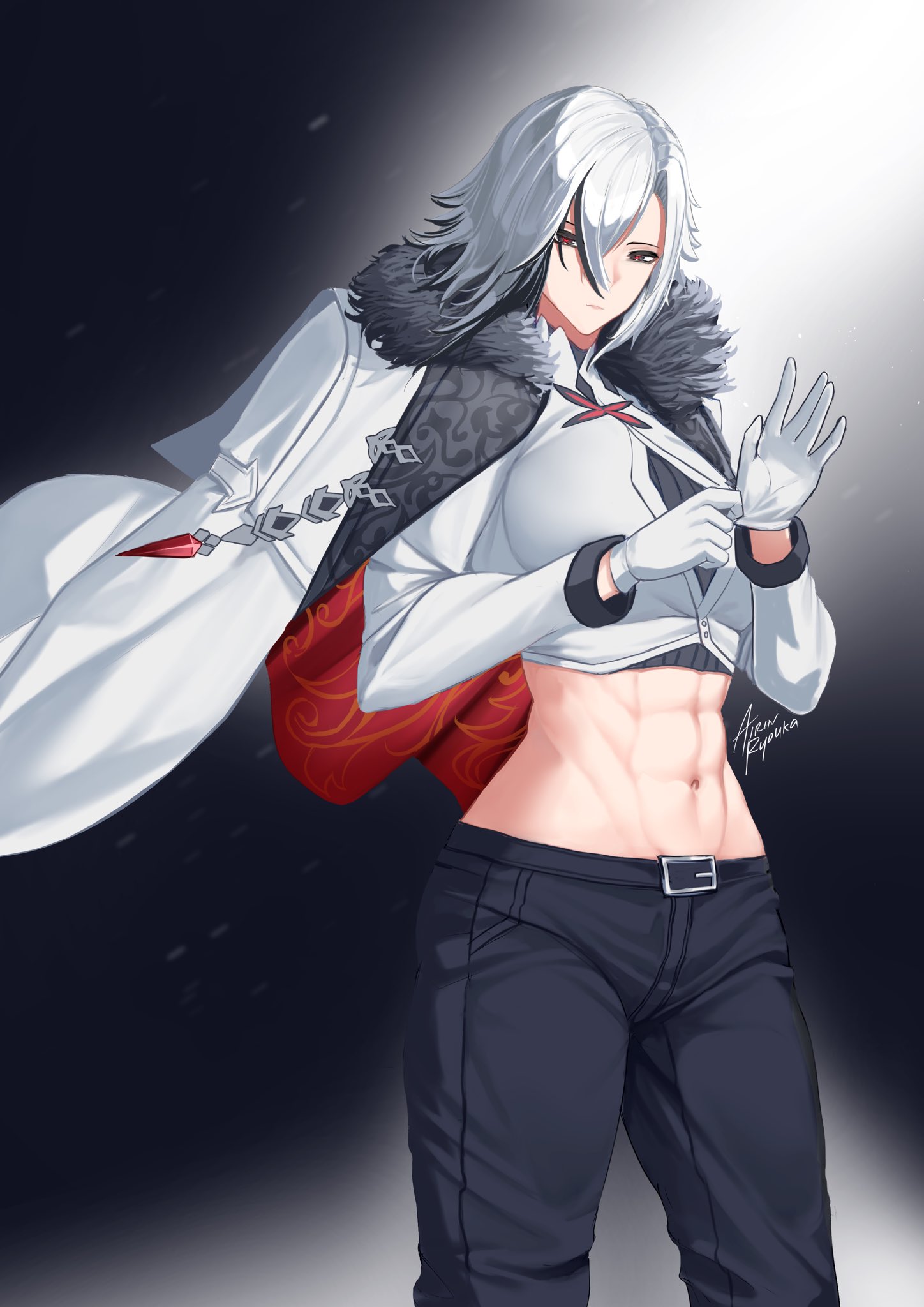 +_+ 1girl abs arlecchino_(genshin_impact) black_background black_eyes black_hair black_pants coat coat_on_shoulders crop_top cropped_jacket fatui_coat fur-trimmed_coat fur_trim genshin_impact gloves hair_between_eyes highres jacket long_sleeves medium_hair midriff multicolored_hair pants ryo_(ryo_artys) solo streaked_hair two-tone_hair white_coat white_gloves white_hair white_jacket