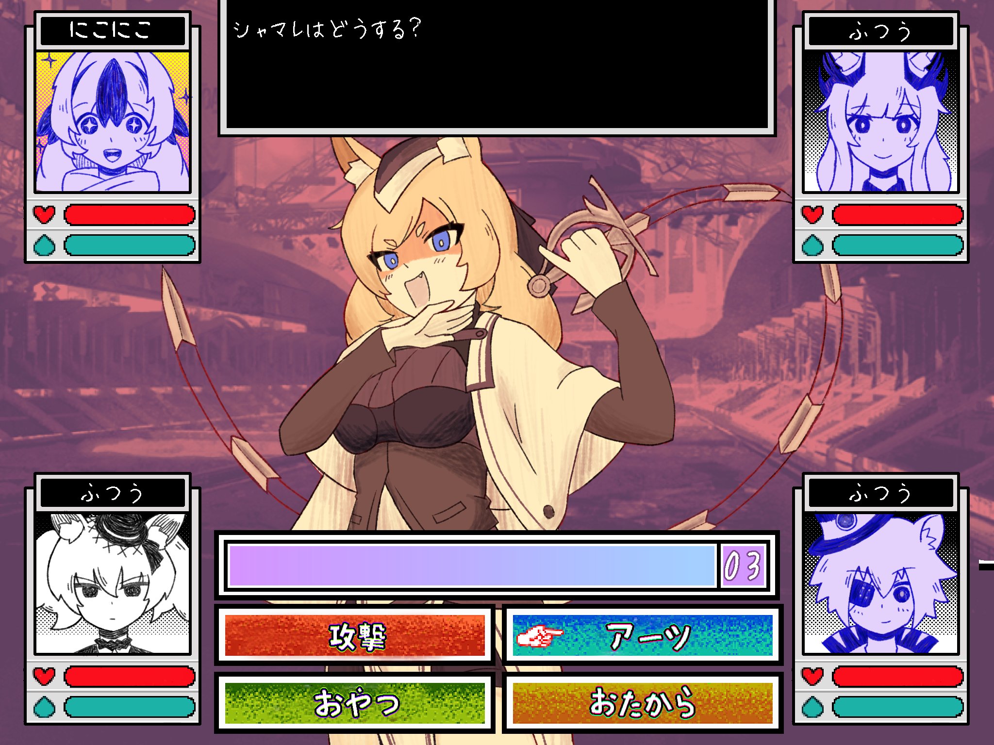 5girls animal_ear_fluff animal_ears ansr_(stigro) arknights blemishine_(arknights) blemishine_(moon_catastrborn)_(arknights) blonde_hair blue_eyes cape click_(arknights) click_(grave_thief)_(arknights) commentary_request eyepatch fake_screenshot fox_ears fox_girl garrison_cap hat highres horse_ears horse_girl mouse_ears mouse_girl multiple_girls official_alternate_costume ojou-sama_pose omori open_mouth parody shaded_face shamare_(arknights) shamare_(echo_of_the_horrorlair)_(arknights) snowsant_(arknights) snowsant_(fated_hero)_(arknights) solo translation_request whislash_(arknights) white_cape