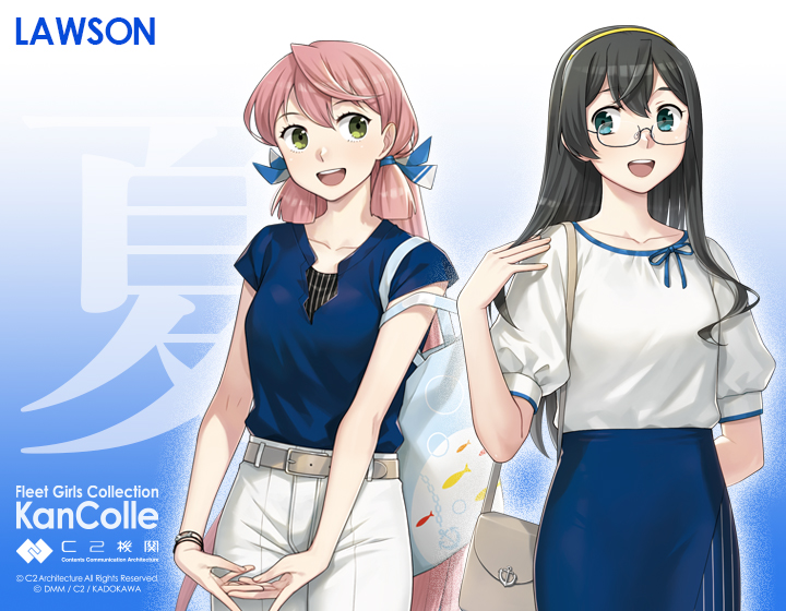 2girls akashi_(kancolle) akashi_(lawson)_(kancolle) black_hair blue_shirt blue_skirt blunt_tresses c2_kikan copyright_name cowboy_shot fujikawa glasses green_eyes hair_ribbon hairband kantai_collection lawson long_hair multiple_girls official_alternate_costume official_art ooyodo_(kancolle) ooyodo_(lawson)_(kancolle) pants pink_hair ribbon semi-rimless_eyewear shirt skirt tress_ribbon under-rim_eyewear white_pants white_shirt
