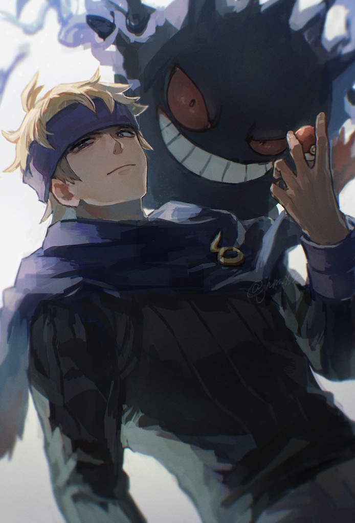 1boy black_sweater blonde_hair closed_mouth commentary_request gen_1_pokemon gengar grey_pants hand_up headband holding holding_poke_ball jhm_xyz long_sleeves male_focus morty_(pokemon) nintendo pants poke_ball poke_ball_(basic) pokemon pokemon_(creature) pokemon_heartgold_and_soulsilver purple_headband purple_scarf scarf short_hair sweater white_background