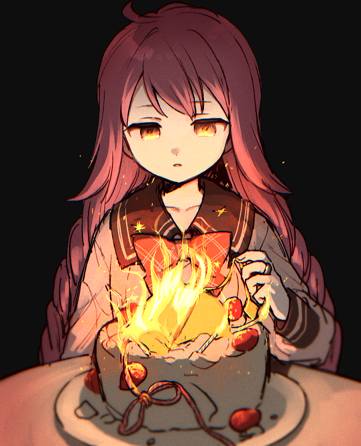 1girl ahoge birthday_cake black_background bow bowtie boyano braid brown_shirt cake candle dot_nose eye_reflection fire food food_malfunction fruit hand_up himuro_lavi iwakiriyama_high_school_uniform jewelry long_hair long_sleeves looking_at_object looking_down magia_record:_mahou_shoujo_madoka_magica_gaiden mahou_shoujo_madoka_magica orange_bow orange_bowtie pink_hair plaid_bow plaid_bowtie plaid_clothes plate reflection ring school_uniform shirt sidelocks solo strawberry swept_bangs twin_braids twintails upper_body very_long_hair wing_collar