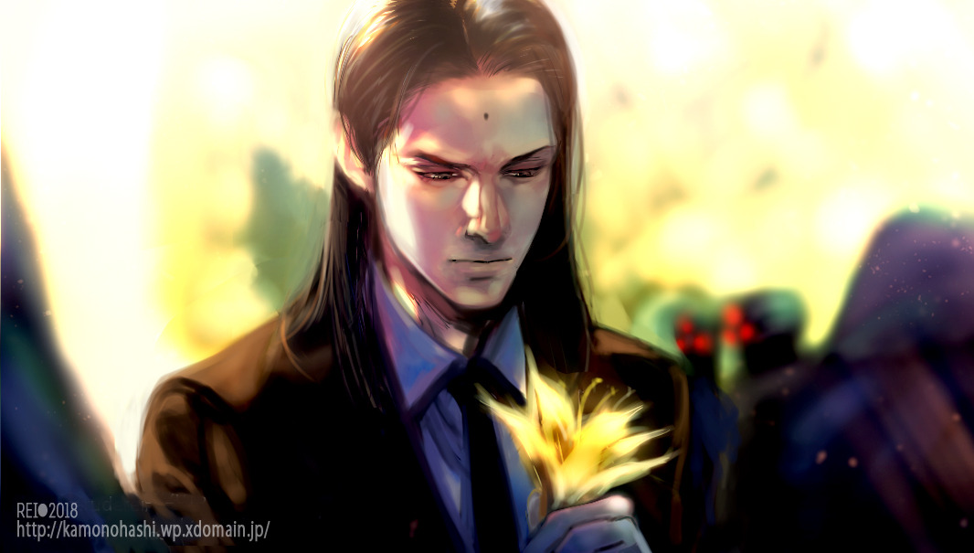 1boy bindi black_hair black_jacket final_fantasy final_fantasy_vii flower formal_clothes hair_behind_ear holding holding_flower jacket karameruderei long_hair looking_at_object male_focus necktie shirt solo square_enix tseng turks_(ff7) upper_body watermark web_address white_shirt yellow_flower