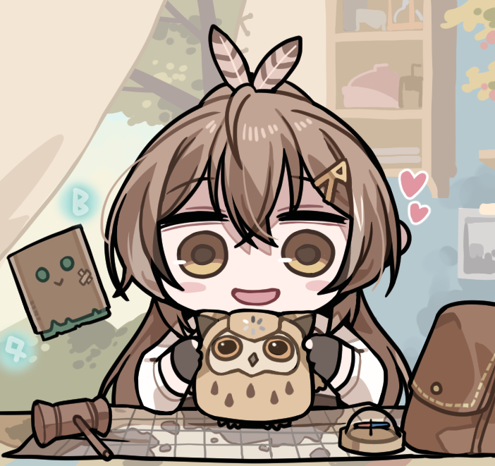 1girl ahoge bird brown_eyes brown_hair buffering chibi clipe compass curtains feather_hair_ornament feathers friend_(nanashi_mumei) gavel hair_ornament hairclip hololive hololive_english hootsie_(nanashi_mumei) hourglass long_hair map mountainous_horizon multicolored_hair nanashi_mumei nanashi_mumei_(1st_costume) owl photo_(object) ponytail pouch shirt smile streaked_hair treehouse very_long_hair virtual_youtuber white_shirt