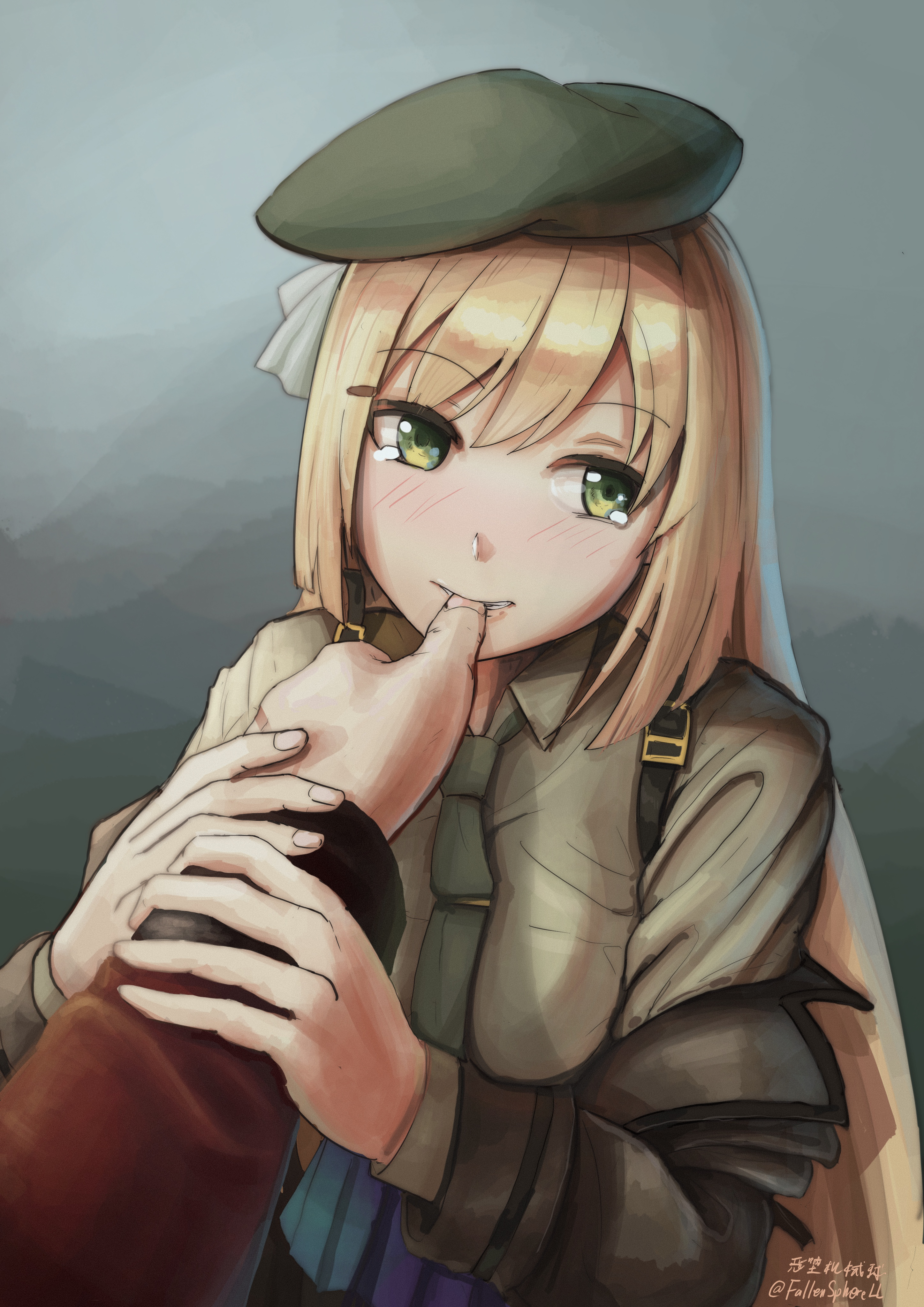 1boy 1girl absurdres bad_id bad_pixiv_id beret biting blonde_hair brown_shirt fallenspherell biting_finger girls'_frontline green_eyes green_headwear green_necktie griffin_&_kryuger_military_uniform hat highres long_hair long_sleeves m1_garand_(girls'_frontline) necktie shirt solo_focus