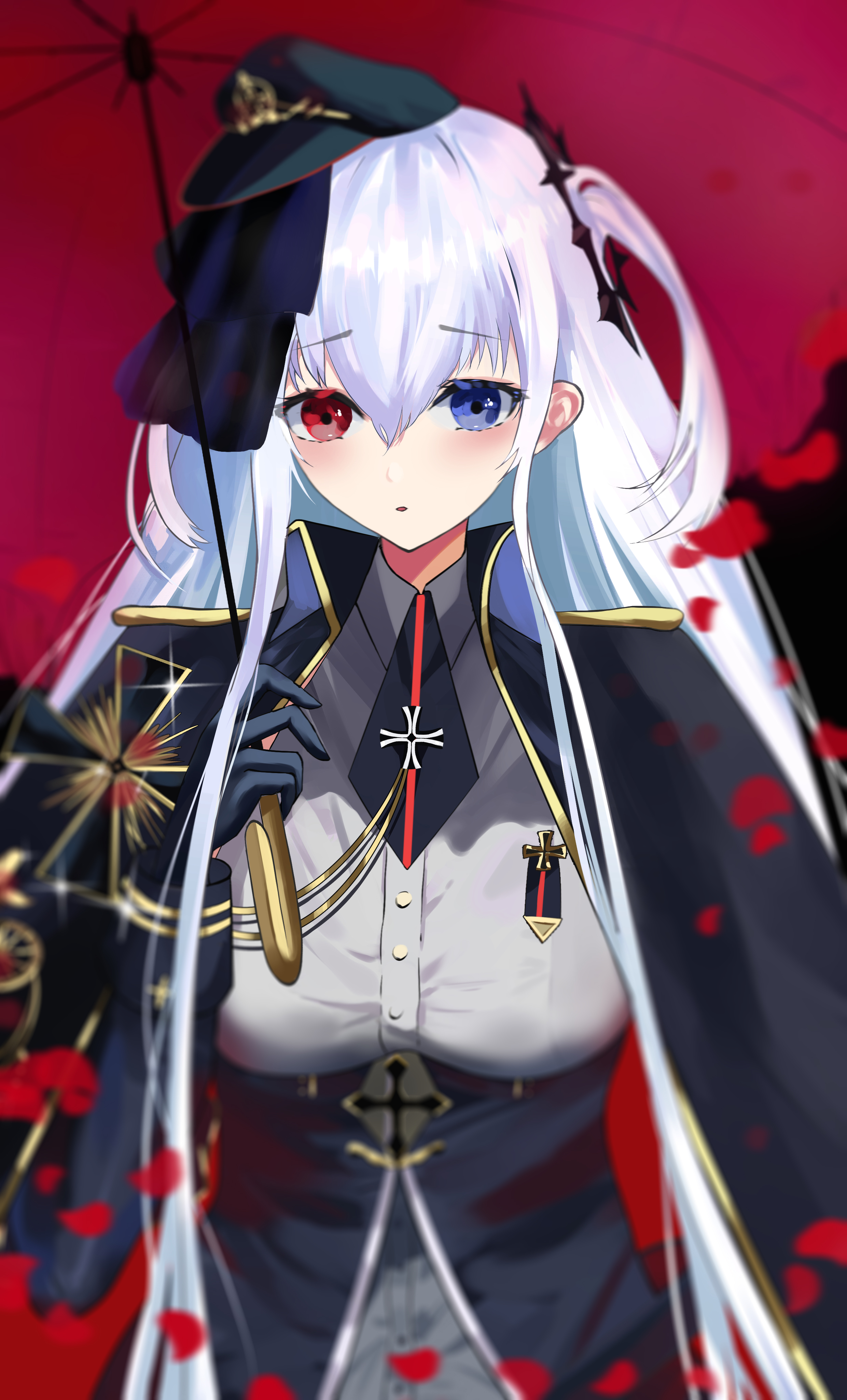 1girl absurdres azur_lane black_gloves black_hat black_necktie blue_eyes breasts cross elbing_(azur_lane) gloves gold_trim grey_shirt hair_between_eyes hat heterochromia highres holding holding_umbrella iron_cross large_breasts long_hair looking_at_viewer mini_hat necktie petals ram_(404272725) red_eyes red_umbrella shirt short_necktie solo umbrella upper_body very_long_hair white_hair