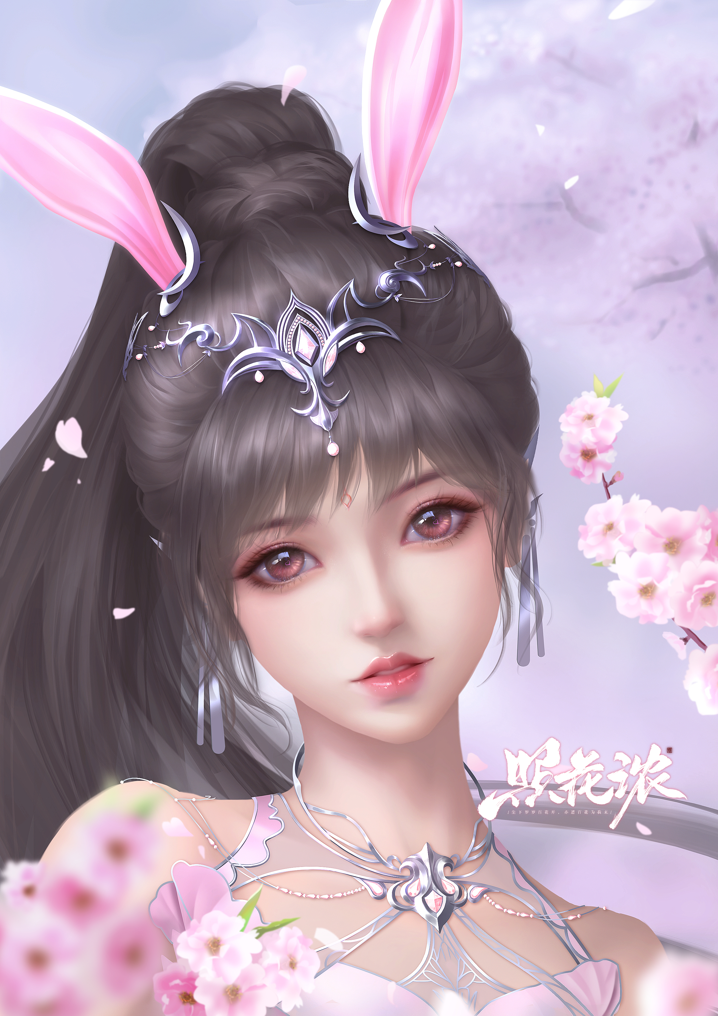 1girl absurdres animal_ears artist_request blue_sky branch brown_hair collar douluo_dalu falling_petals hair_ornament head_tilt highres looking_at_viewer metal_collar open_mouth petals ponytail rabbit_ears second-party_source sky solo teeth xiao_wu_(douluo_dalu)