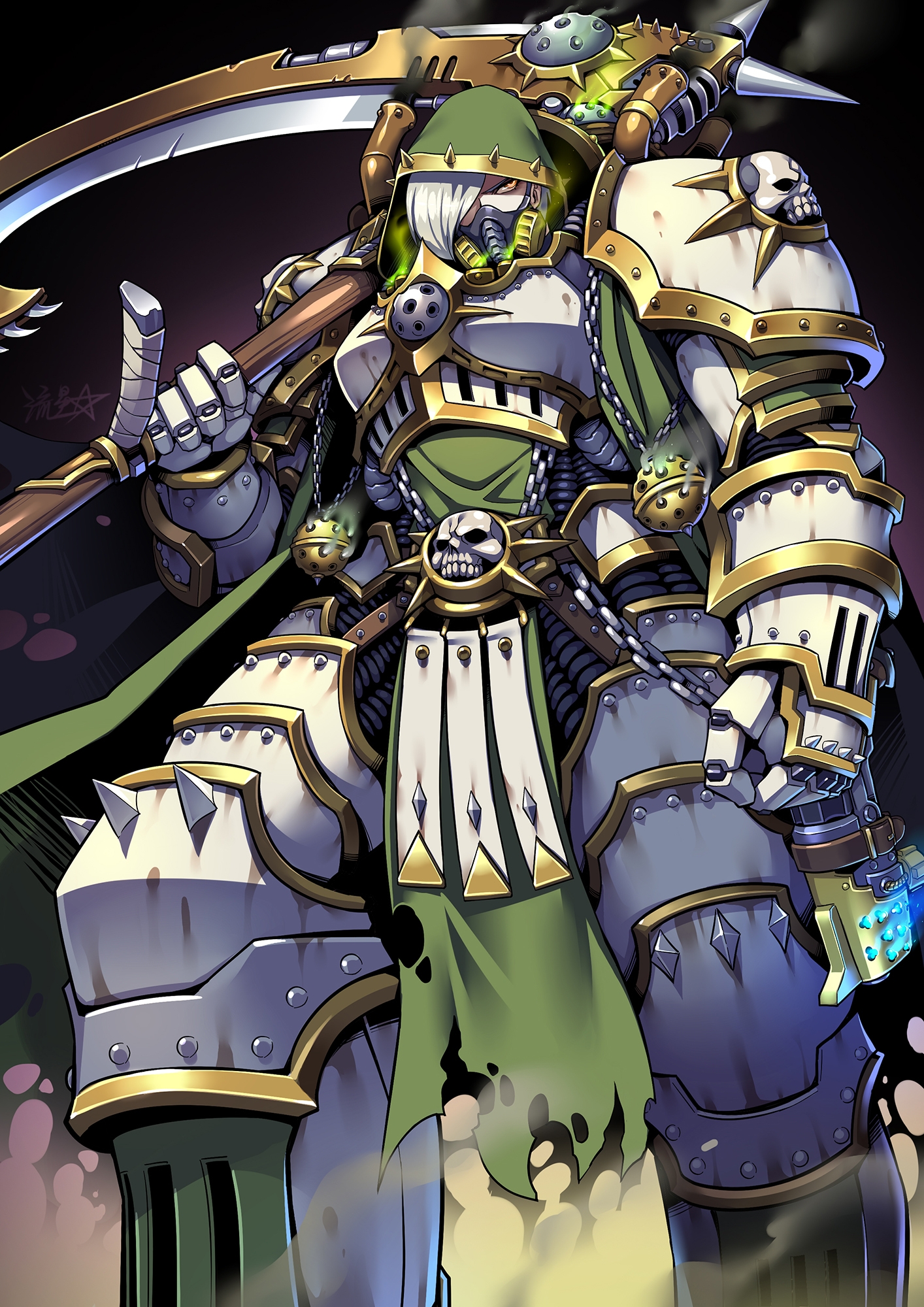1girl adeptus_astartes armor breastplate chaos_(warhammer) death_guard fume gauntlets genderswap genderswap_(mtf) greaves hair_over_one_eye highres holding holding_weapon hood incense mask md5_mismatch mortarion pauldrons power_armor primarch respirator ryuusei_(mark_ii) scythe shoulder_armor signature silence_(scythe) skull solo spikes warhammer_40k weapon white_armor white_hair yellow_eyes