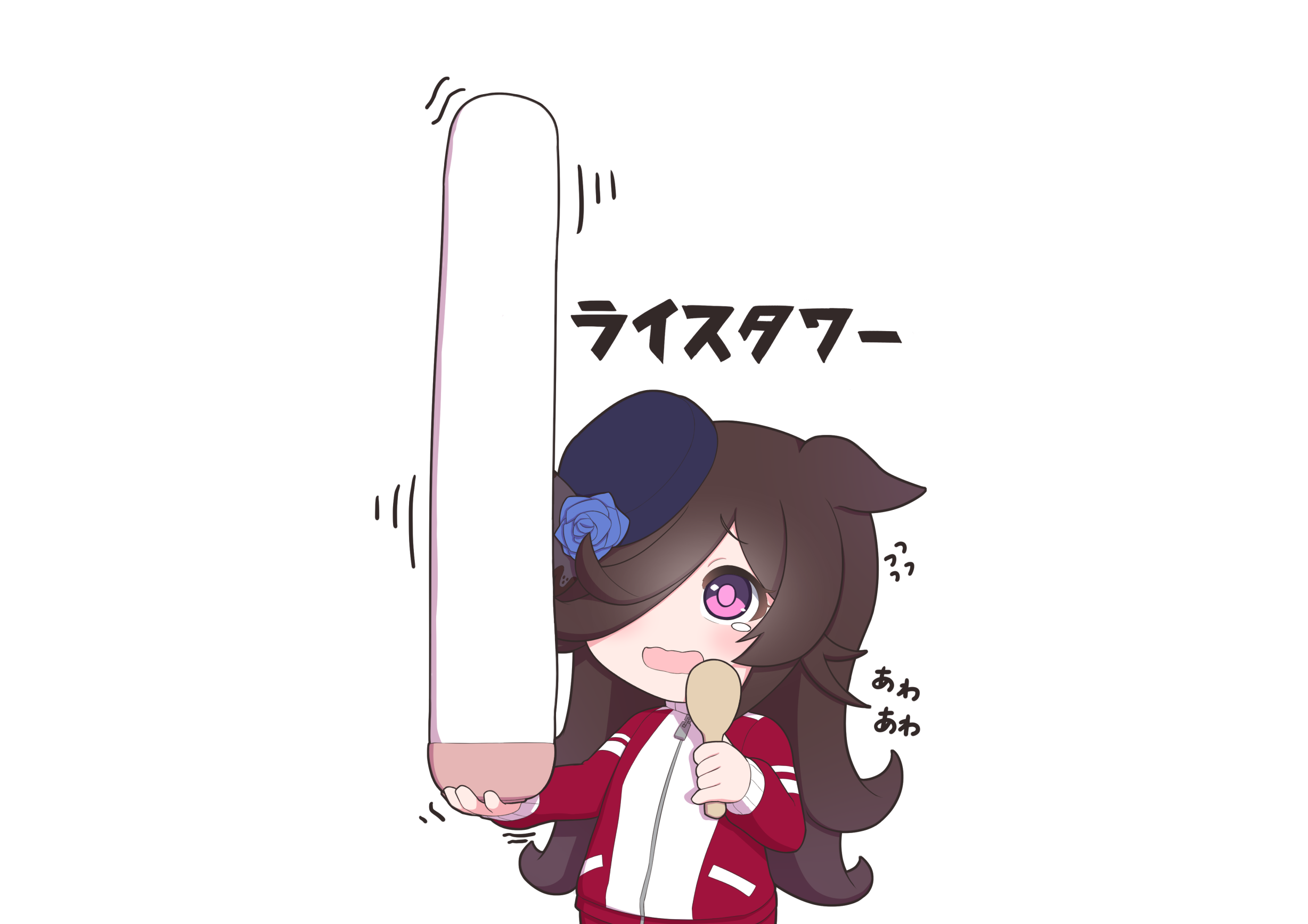 1girl animal_ears black_hair blue_flower blue_hat blue_rose bowl chibi flower hair_over_one_eye hat hat_flower highres holding holding_bowl horse_ears horse_girl jacket kulettula long_hair looking_up purple_eyes rice rice_bowl rice_shower_(umamusume) rose shamoji simple_background solo tilted_headwear tracen_track_uniform track_jacket translated umamusume wavy_mouth white_background