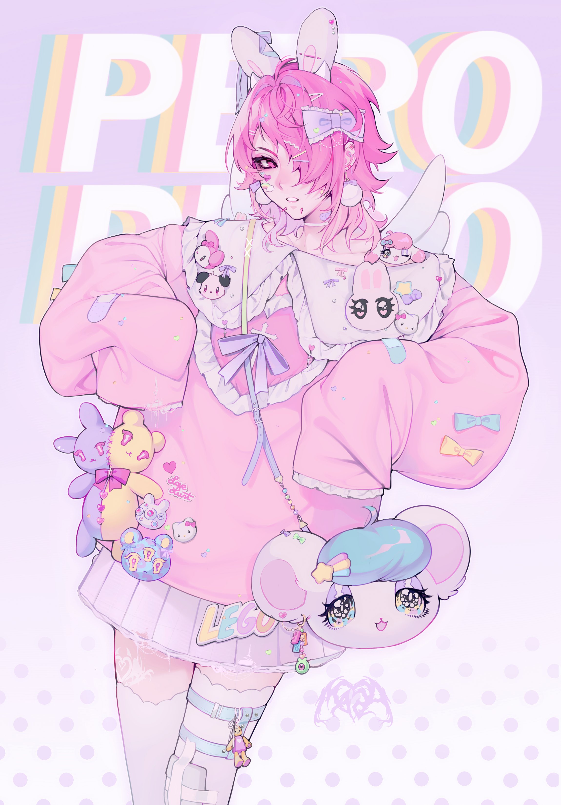 1boy absurdres androgynous animal_ears animal_print bag bandaid bear_print blue_background bow collarbone cowboy_shot crossdressing crossdressing_(mtf) fairy_kei fake_animal_ears frilled_sweater frills green_bow hair_bow hair_ornament hair_over_one_eye hairclip hands_up heart highres jewelry lego long_sleeves looking_at_viewer male_focus mazamuno medium_hair mongrel_(mazamuno) multiple_thigh_straps my_melody_(series) original panda_print parted_lips pill pink_background pink_bow pink_eyes pink_hair pink_ribbon pink_sweater pink_theme rabbit_print revision ribbon sanrio short_hair shoulder_bag sleeves_past_fingers sleeves_past_wrists solo stuffed_animal stuffed_toy sweater teddy_bear thigh_strap thighhighs trap white_thighhighs yami_kawaii yellow_bow yume_kawaii