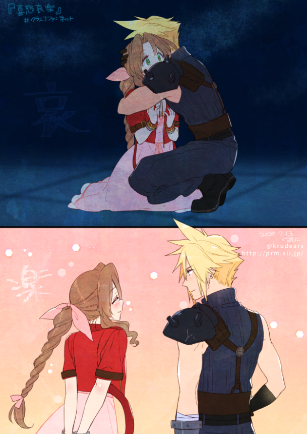 1boy 1girl aerith_gainsborough arm_around_another's_back armor arms_behind_back bangle belt blonde_hair blue_eyes blue_pants blue_shirt blush boots bracelet braid braided_ponytail brown_hair choker closed_eyes cloud_strife comforting couple cropped_jacket dress final_fantasy final_fantasy_vii final_fantasy_vii_remake flower_choker gloves green_eyes hair_between_eyes hair_ribbon hand_on_another's_head hand_on_own_hip hug jacket jewelry krudears long_dress multiple_belts multiple_views on_ground pants parted_bangs pink_background pink_dress pink_ribbon red_jacket ribbon shirt short_hair short_sleeves shoulder_armor sidelocks sleeveless sleeveless_turtleneck spiked_hair square_enix suspenders tile_floor tiles train_graveyard turtleneck upper_body wavy_hair