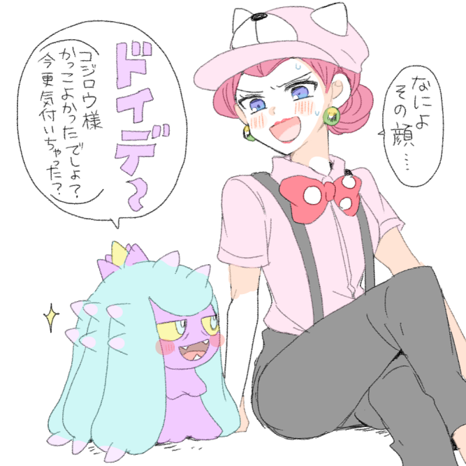 1girl :d arm_support atsumi_yoshioka blue_eyes blush collared_shirt commentary_request crossed_legs earrings eyelashes gen_7_pokemon hat jessie_(pokemon) jewelry mareanie nintendo open_mouth pants pink_headwear pink_shirt pokemon pokemon_(anime) pokemon_(creature) pokemon_the_series:_sun_&_moon shirt short_sleeves sitting smile speech_bubble suspenders sweat tongue translation_request