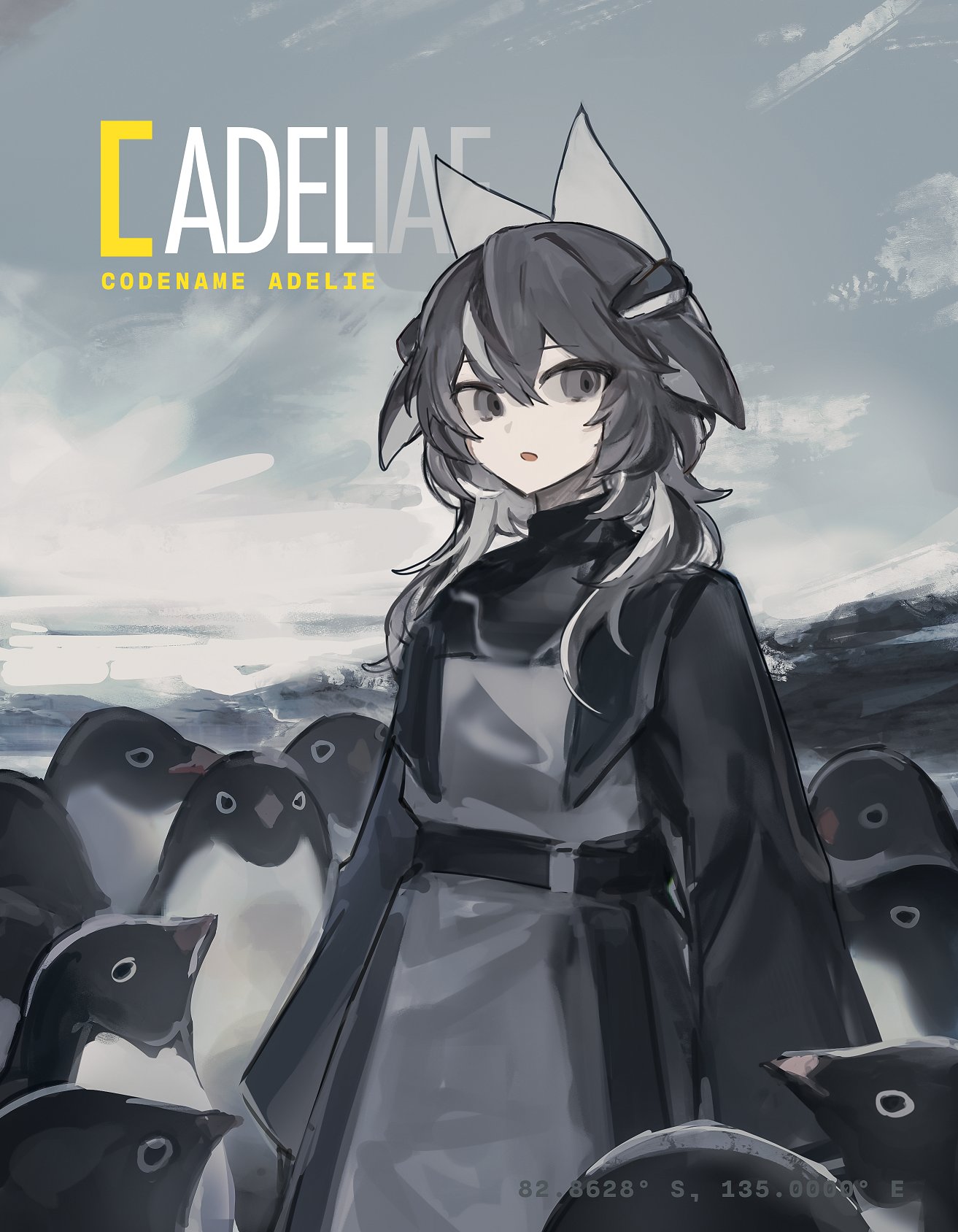 1girl :o animal animal_ears bird commentary cowboy_shot grey_eyes grey_hair grey_shirt grey_skirt grey_sky hair_between_eyes headgear highres iwis long_sleeves looking_at_viewer medium_hair multicolored_hair original outdoors penguin shirt skirt sky solo streaked_hair untranslatable_commentary