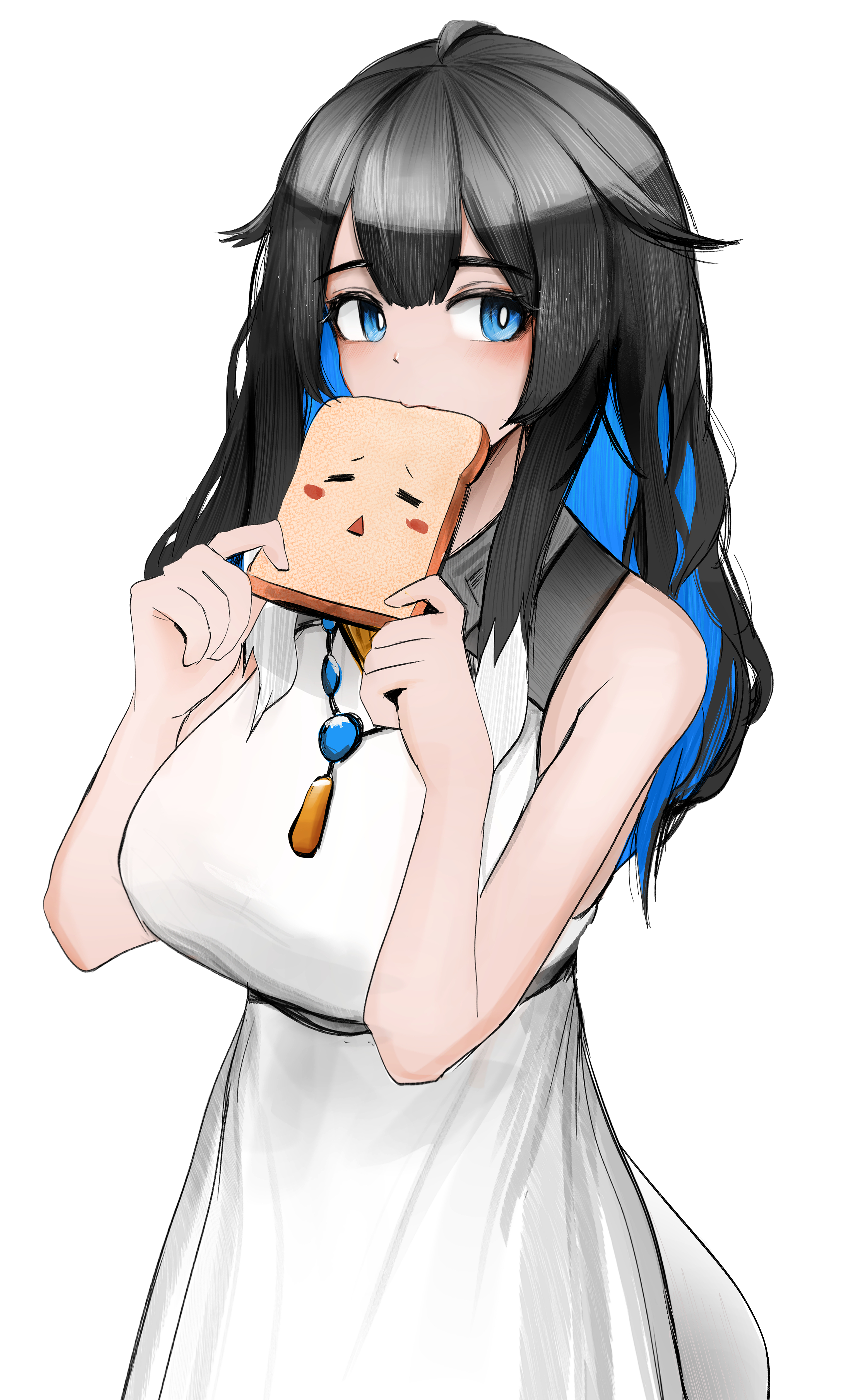 1girl absurdres alternate_hair_length alternate_hairstyle arknights bare_shoulders black_hair blue_eyes blue_hair bread breasts colored_inner_hair dress eating flower food hair_flower hair_ornament highres holding holding_food jewelry kjera_(arknights) large_breasts long_hair multicolored_hair necklace sidelocks simple_background sleeveless sleeveless_dress solo tail upper_body wawamachi white_background white_dress