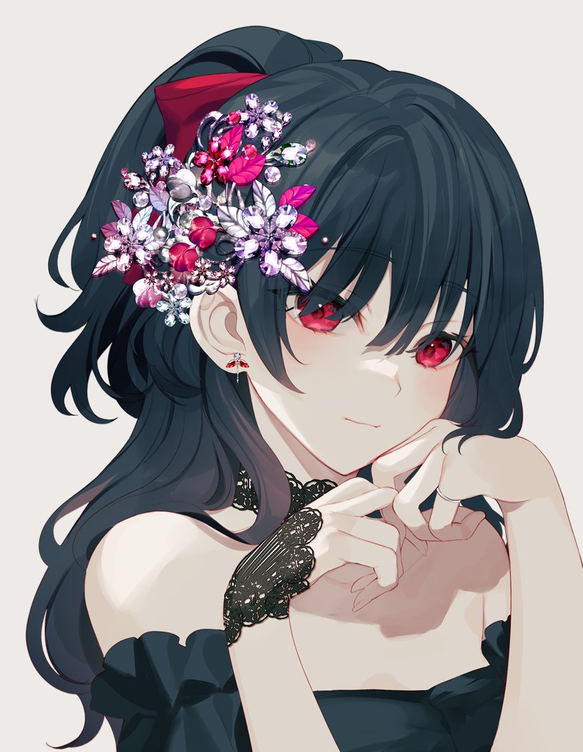 1girl :/ achiki black_choker black_dress black_hair bow choker dress flower flower_choker hair_between_eyes hair_flower hair_ornament hand_on_own_chin high_ponytail light_blush long_hair looking_at_viewer original ponytail portrait red_bow red_eyes simple_background solo white_background
