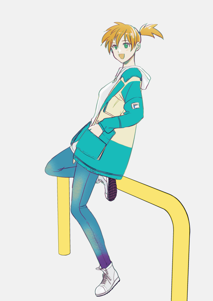 1girl asymmetrical_hair breasts denim green_eyes gym_leader jacket jeans kamele legs misty_(pokemon) nintendo orange_hair pants pokemon pokemon_red/green/blue/yellow ponytail shirt short_hair side_ponytail thighs white_shirt