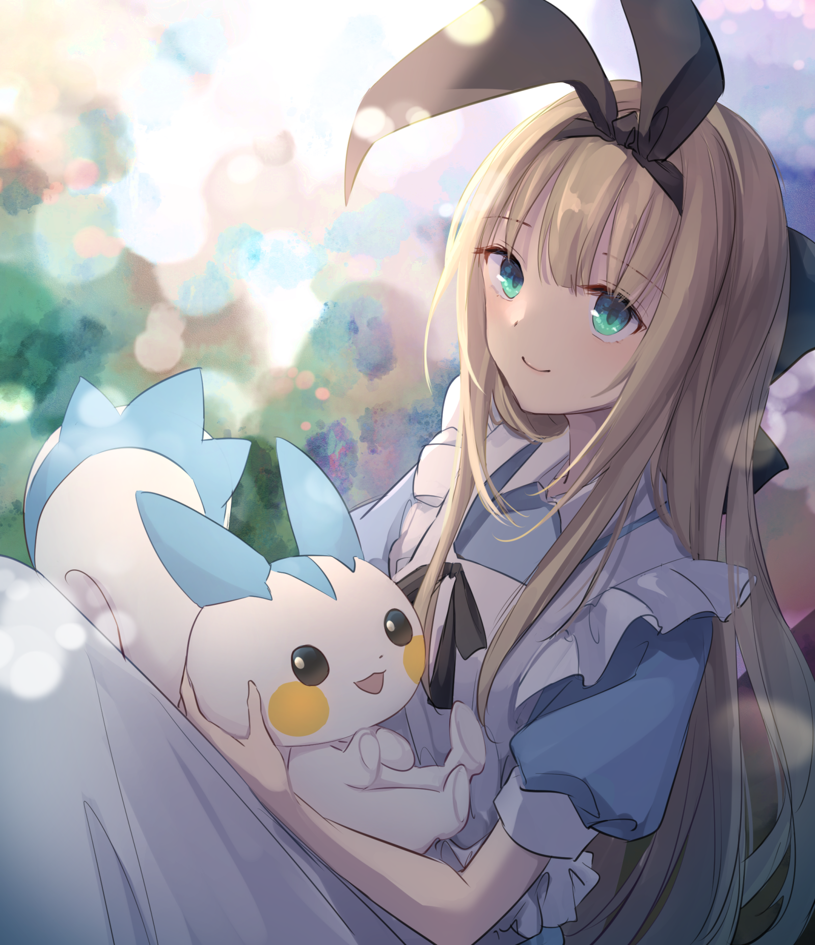 1girl apron black_bow black_ribbon blonde_hair blue_dress blurry blurry_background blush bow bow_hairband closed_mouth commentary_request dress frilled_apron frills gen_4_pokemon green_eyes hair_bow hairband highres holding holding_pokemon long_hair looking_at_viewer mononobe_alice mononobe_alice_(1st_costume) nijisanji nintendo open_mouth pachirisu pokemon pokemon_(creature) puffy_short_sleeves puffy_sleeves ribbon short_sleeves smile solo virtual_youtuber white_apron yukkering_(yukke)