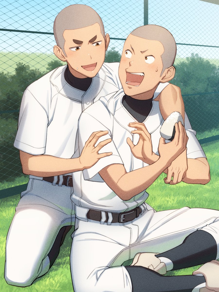 2boys arm_around_shoulder baseball_jersey baseball_uniform belt bush chain-link_fence day fence food highres holding holding_food indian_style jersey looking_at_another looking_back male_focus multiple_boys onigiri open_mouth original outdoors shaved_head sitting smile sportswear sweatdrop tettabuzz thick_eyebrows v-shaped_eyebrows