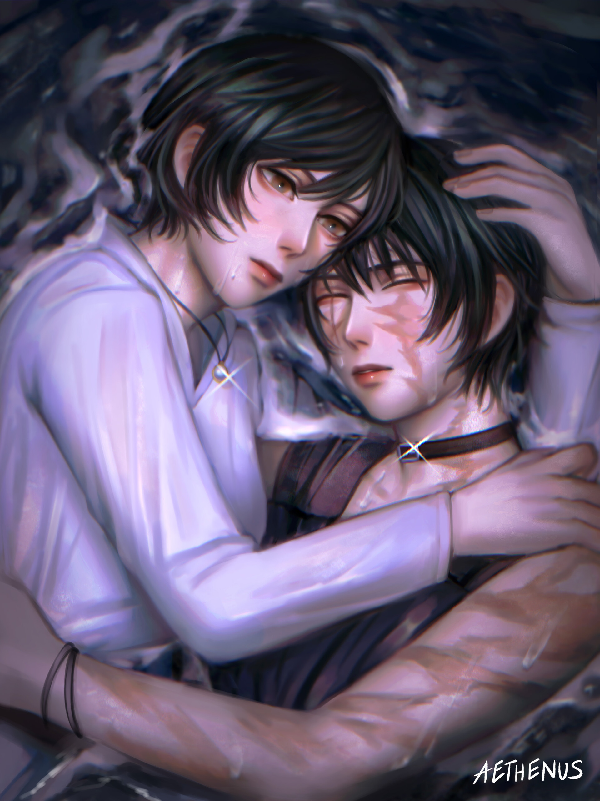 absurdres black_hair black_tank_top burn_scar collar highres hug hugging_each_other jujutsu_kaisen scar scar_on_face shirt short_hair tank_top white_shirt zen'in_mai zen'in_maki