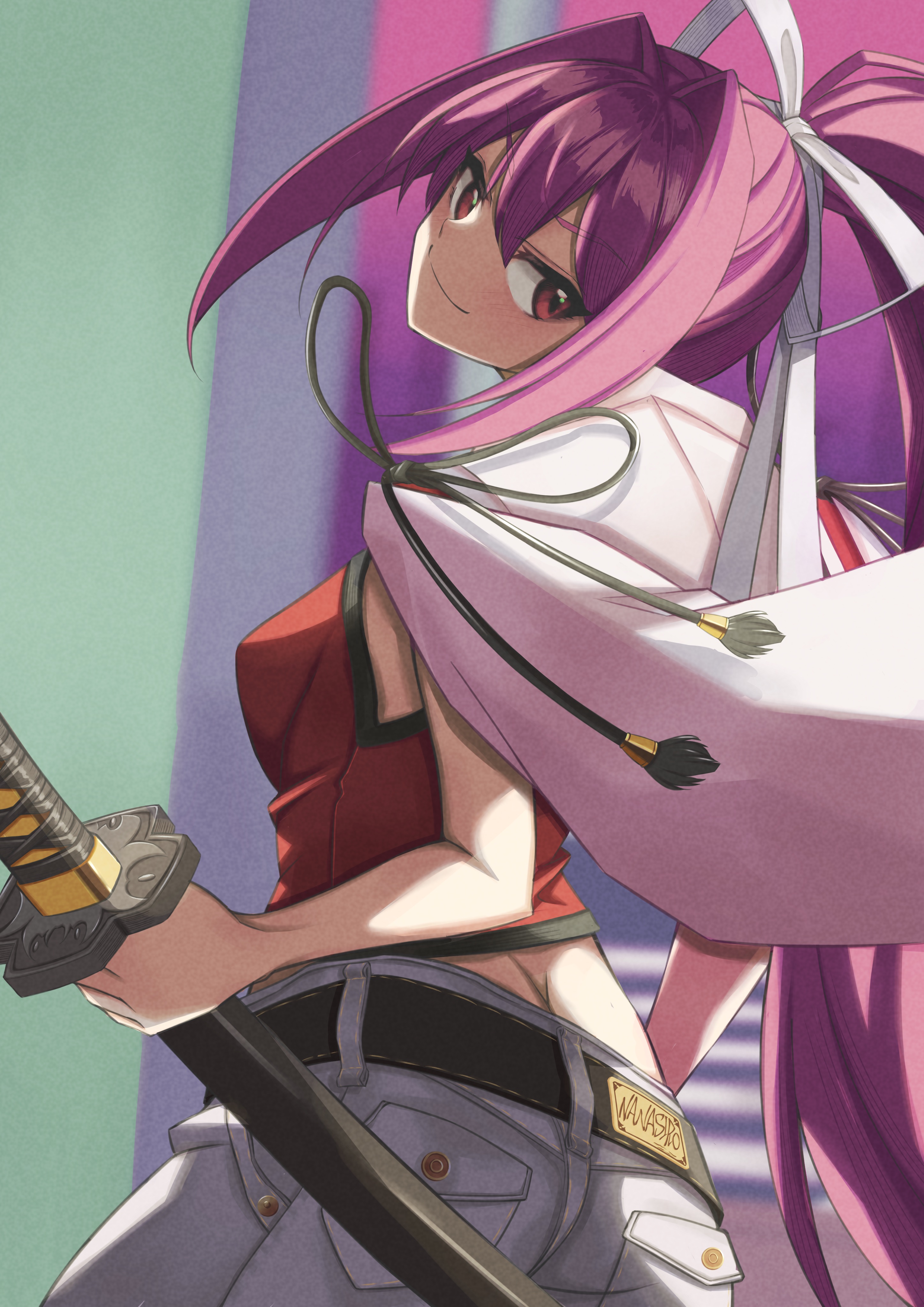 1girl absurdres artist_request ass belt butt_crack coat coat_on_shoulders denim hair_ribbon head_tilt highres jeans katana long_hair looking_back pants pocket ponytail purple_hair red_eyes ribbon smile sword tagme tank_top tassel under_night_in-birth weapon white_pants yuzuriha_(under_night_in-birth)