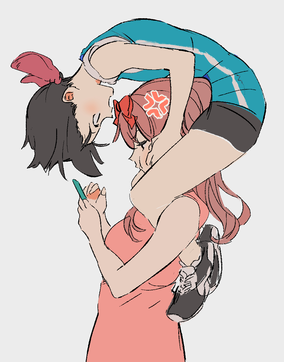 2girls anger_vein black_hair carrying hair_ribbon hanebado! hanesaki_ayano holding holding_phone kakeami legs multiple_girls on_person open_mouth phone piggyback pink_ribbon pink_shirt red_ribbon ribbon serigaya_kaoruko shirt shorts sleeveless sportswear thighs