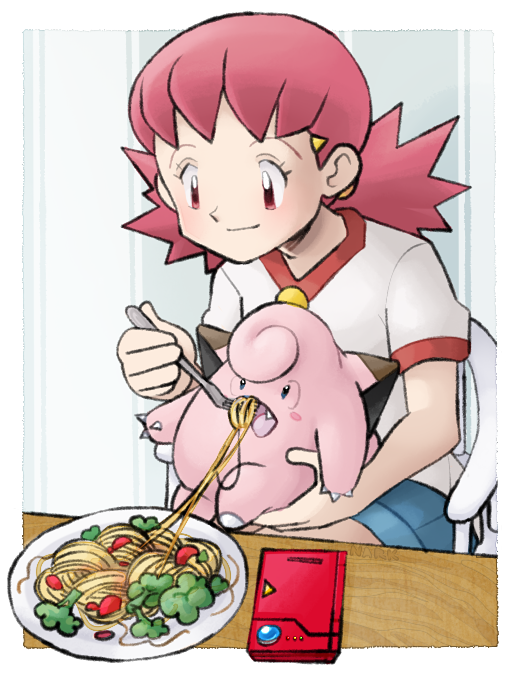 1girl blush_stickers chair clefairy fang feeding food fork gen_1_pokemon holding holding_fork nark nintendo on_lap open_mouth pasta pink_eyes pink_hair plate pokedex pokemon pokemon_(creature) pokemon_heartgold_and_soulsilver shorts sitting smile spaghetti whitney_(pokemon)