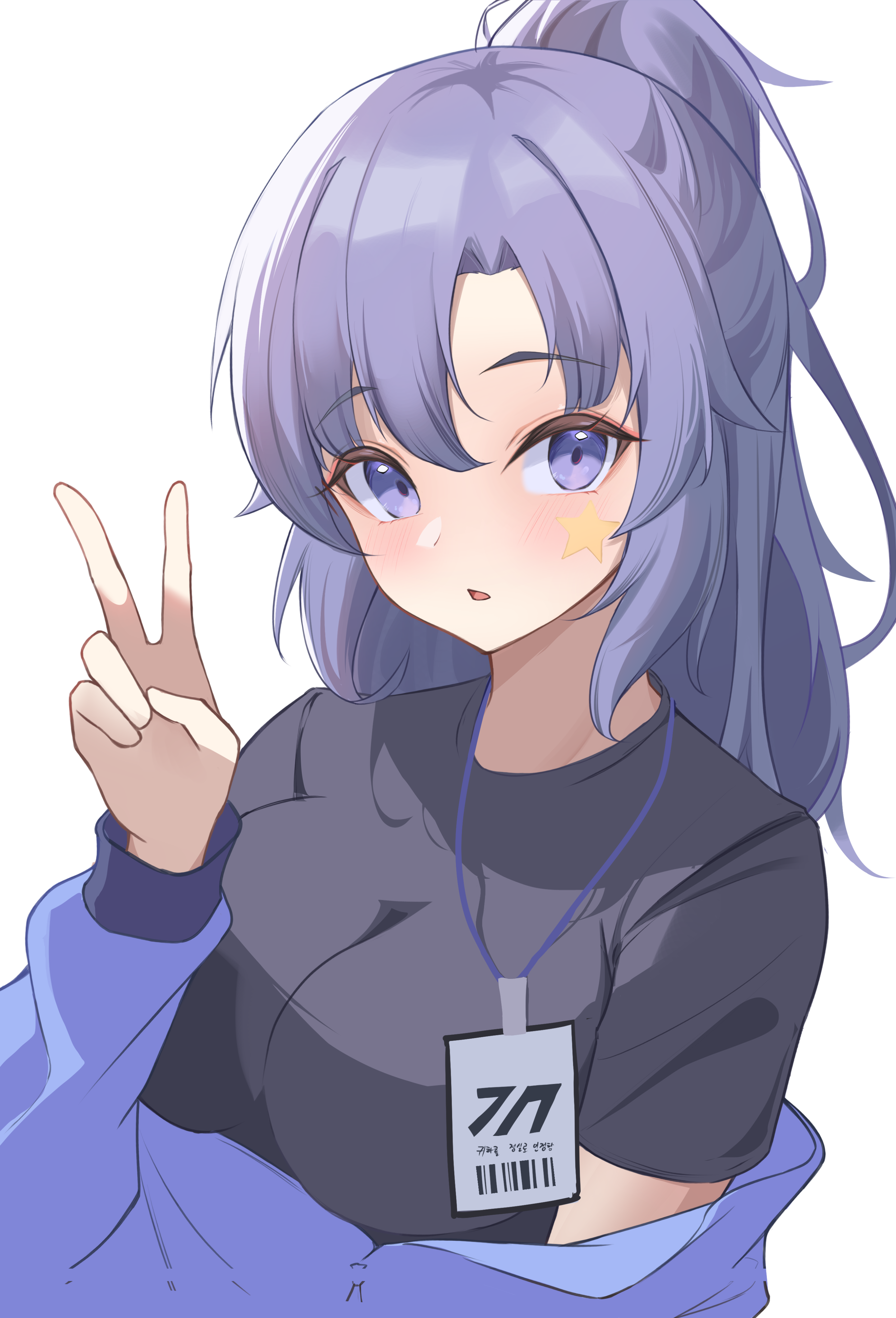 1girl absurdres black_shirt blue_archive blue_jacket blush breasts cleavage hand_up highres impossible_clothes impossible_shirt jacket lanyard long_hair long_sleeves looking_at_viewer medium_breasts off_shoulder open_mouth parted_lips ponytail purple_eyes purple_hair shirt short_sleeves simple_background sticker sticker_on_face t-shirt toki_(rumukio) upper_body white_background yuuka_(blue_archive) yuuka_(track)_(blue_archive)