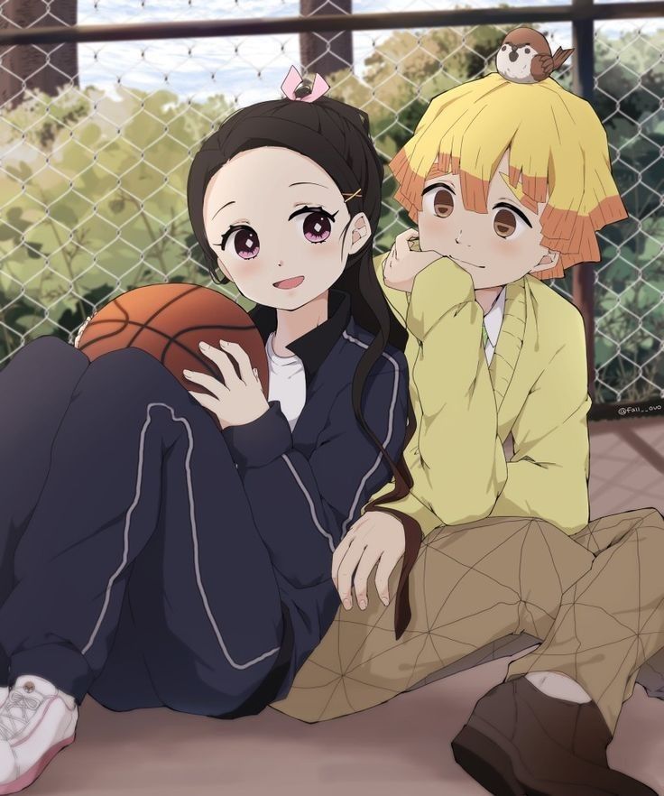 1boy 1girl agatsuma_zenitsu ball basketball basketball_(object) black_hair blonde_hair blue_pants chuntarou_(kimetsu_no_yaiba) gym_shirt gym_uniform hair_ornament hair_ribbon kamado_nezuko kimetsu_gakuen kimetsu_no_yaiba long_hair long_sleeves multicolored_hair necktie open_mouth pants pink_eyes pink_ribbon ponytail pori_(kmt_pori) ribbon school_uniform shirt shoes short_hair smile source_request vest yellow_eyes