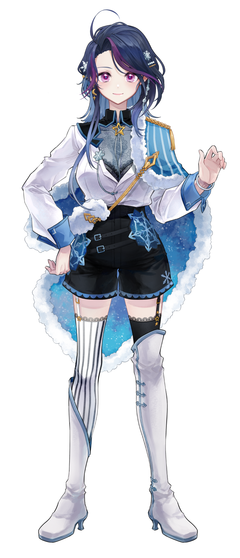 1girl ahoge ankle_boots asymmetrical_footwear asymmetrical_legwear belt black_belt black_bra black_shorts black_thighhighs blue_cape blue_hair blue_shirt boots bra bracelet breasts cape cleavage collared_shirt crescent crescent_earrings curly_hair dark_blue_hair earrings epaulettes floral_print full_body fur-trimmed_cape fur_trim future_land garter_straps hair_intakes hair_ornament hand_on_own_hip hand_up high_heel_boots high_heels highres jacket jewelry kallen_(future_land) long_sleeves medium_hair mismatched_legwear multicolored_hair official_art parted_bangs purple_eyes purple_hair see-through_clothes see-through_shirt shantianajiang shirt shorts sidelocks single_earring smile snowflake_hair_ornament snowflake_print solo standing star_(symbol) star_earrings star_pin streaked_hair striped_clothes striped_thighhighs swept_bangs thigh_boots thighhighs transparent_background underwear uneven_footwear vertical-striped_cape vertical-striped_clothes vertical-striped_thighhighs virtual_youtuber white_boots white_jacket white_thighhighs zettai_ryouiki