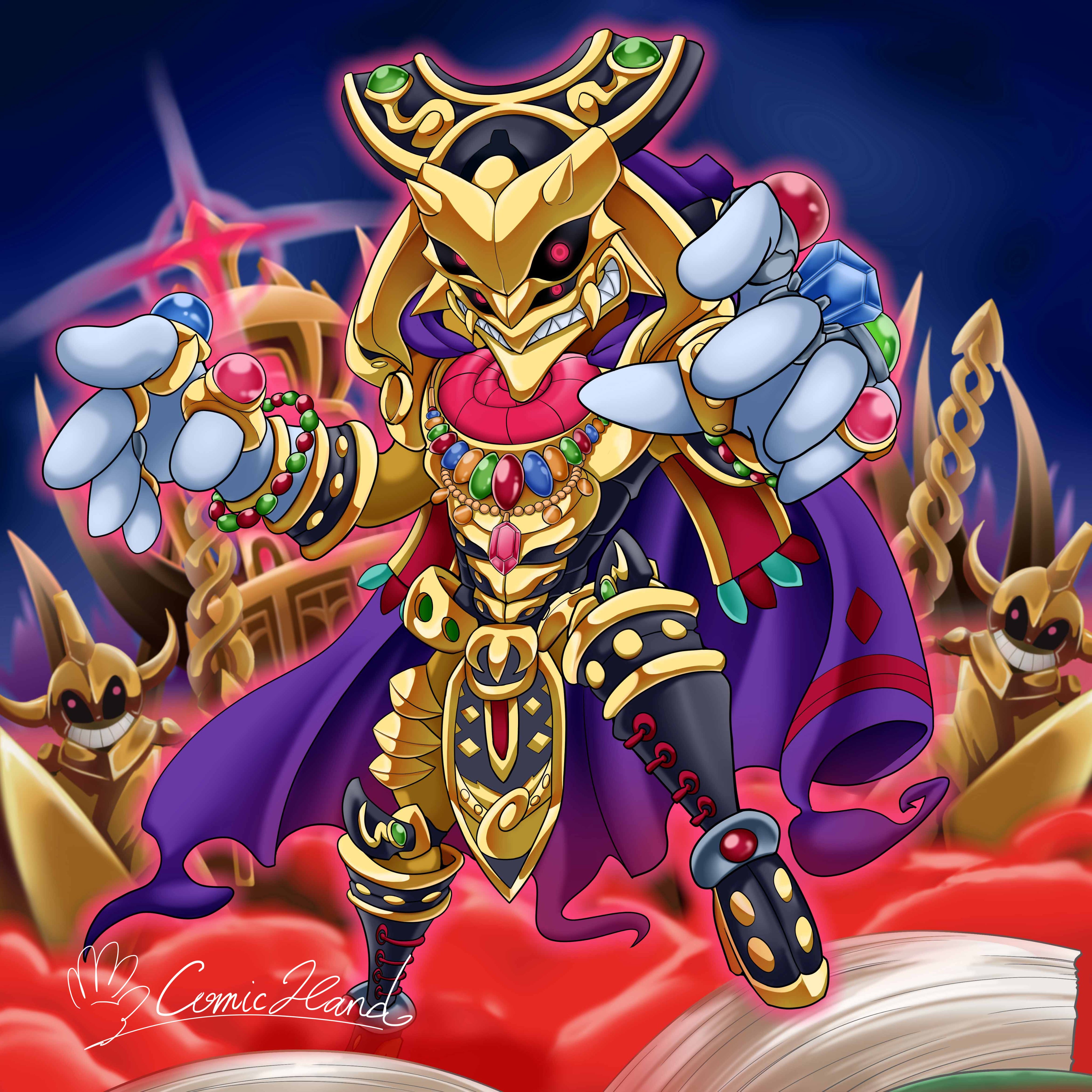 3boys absurdres alternate_form alternate_universe armor artist_request cape comic_hand duel_monster eldlich_the_golden_lord full_armor full_body gloves glowing glowing_eyes gold_armor highres horns multicolored_hair multiple_boys shoulder_spikes spikes two-tone_hair white_gloves wide_sleeves yu-gi-oh!