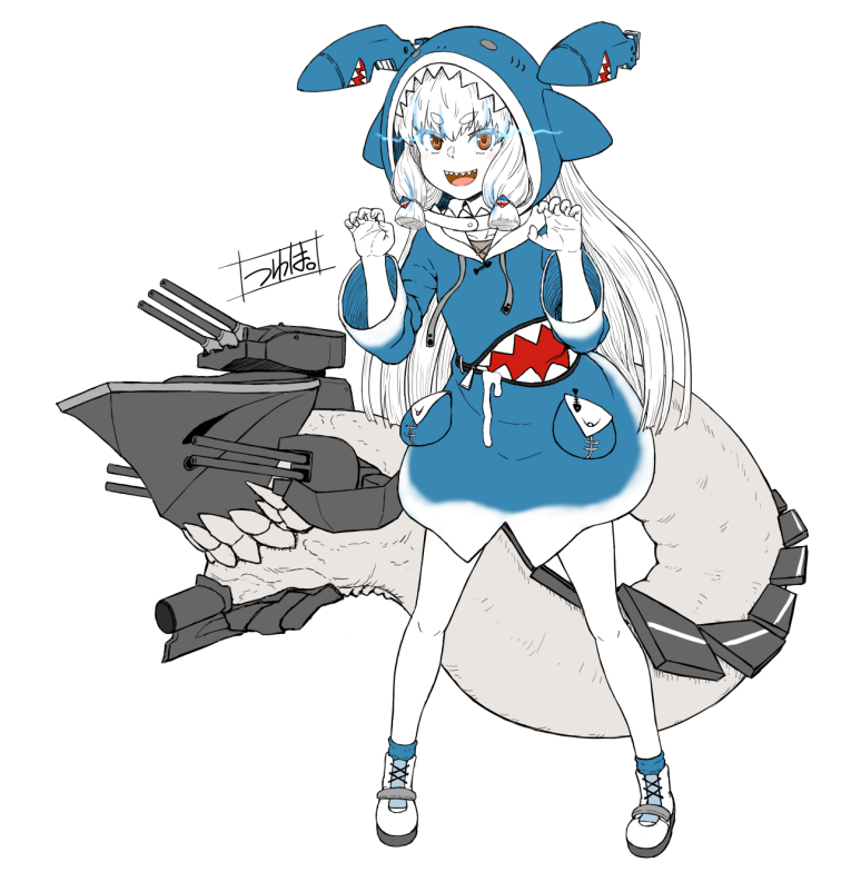 1girl abyssal_ship animal_hood blue_hoodie cosplay full_body gawr_gura gawr_gura_(cosplay) glowing glowing_eyes grin hair_ornament headgear hololive hololive_english hood hoodie kantai_collection long_hair long_sleeves looking_at_viewer minazuki_tsuyuha murakumo_(kancolle) open_mouth orange_eyes re-class_battleship re-class_battleship_(cosplay) shark_hair_ornament shark_hood sharp_teeth shoes smile sneakers solo tail teeth virtual_youtuber white_background white_hair wide_sleeves