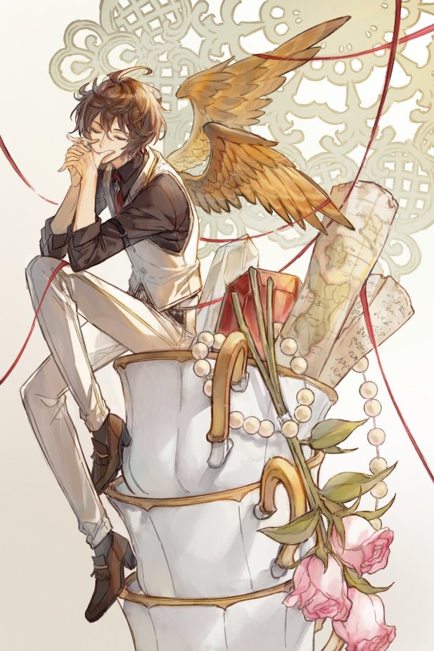 1boy black_shirt brown_footwear brown_hair brown_wings cup closed_eyes feathered_wings fingers_to_mouth flower granblue_fantasy j999 jewelry male_focus map necklace necktie pants pearl_necklace sandalphon_(granblue_fantasy) shirt sitting teacup vest white_pants wings