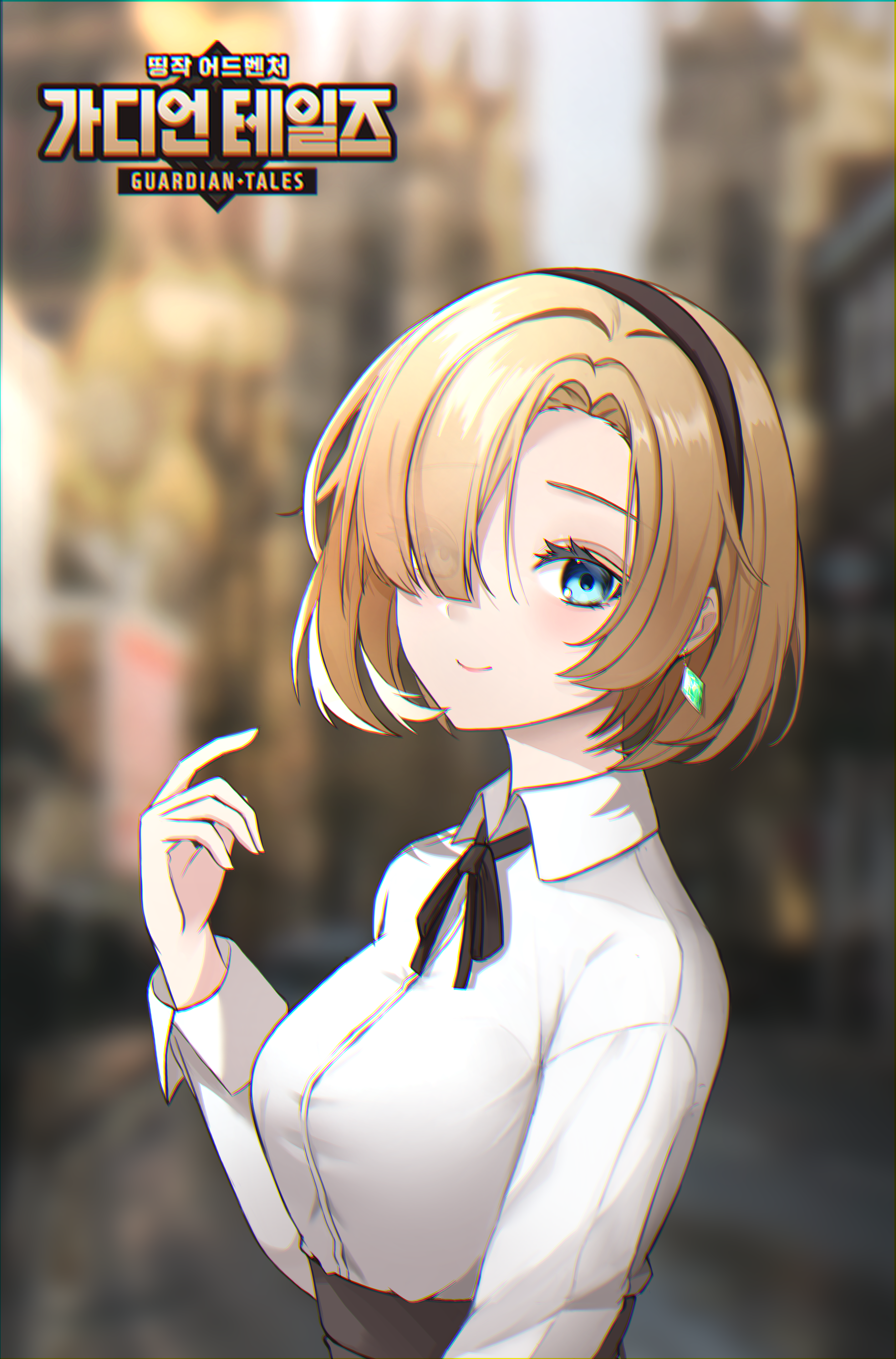 1girl absurdres blonde_hair blue_eyes blurry blurry_background breasts earrings future_princess guardian_tales hair_over_one_eye hairband hand_up highres hong_woo_seok jewelry logo looking_at_viewer medium_breasts medium_hair shirt smile upper_body white_shirt