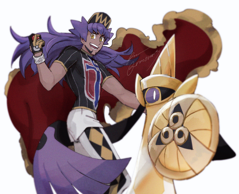 1boy :d aegislash baseball_cap blurry cape champion_uniform commentary_request dark-skinned_male dark_skin dynamax_band facial_hair from_below fur-trimmed_cape fur_trim gen_6_pokemon hand_up hat holding holding_poke_ball leggings leon_(pokemon) long_hair male_focus nintendo open_mouth poke_ball poke_ball_(basic) pokemon pokemon_sword_and_shield purple_hair red_cape sagemaru-br shield_print shirt short_shorts short_sleeves shorts smile sword_print teeth tongue white_background white_shorts yellow_eyes
