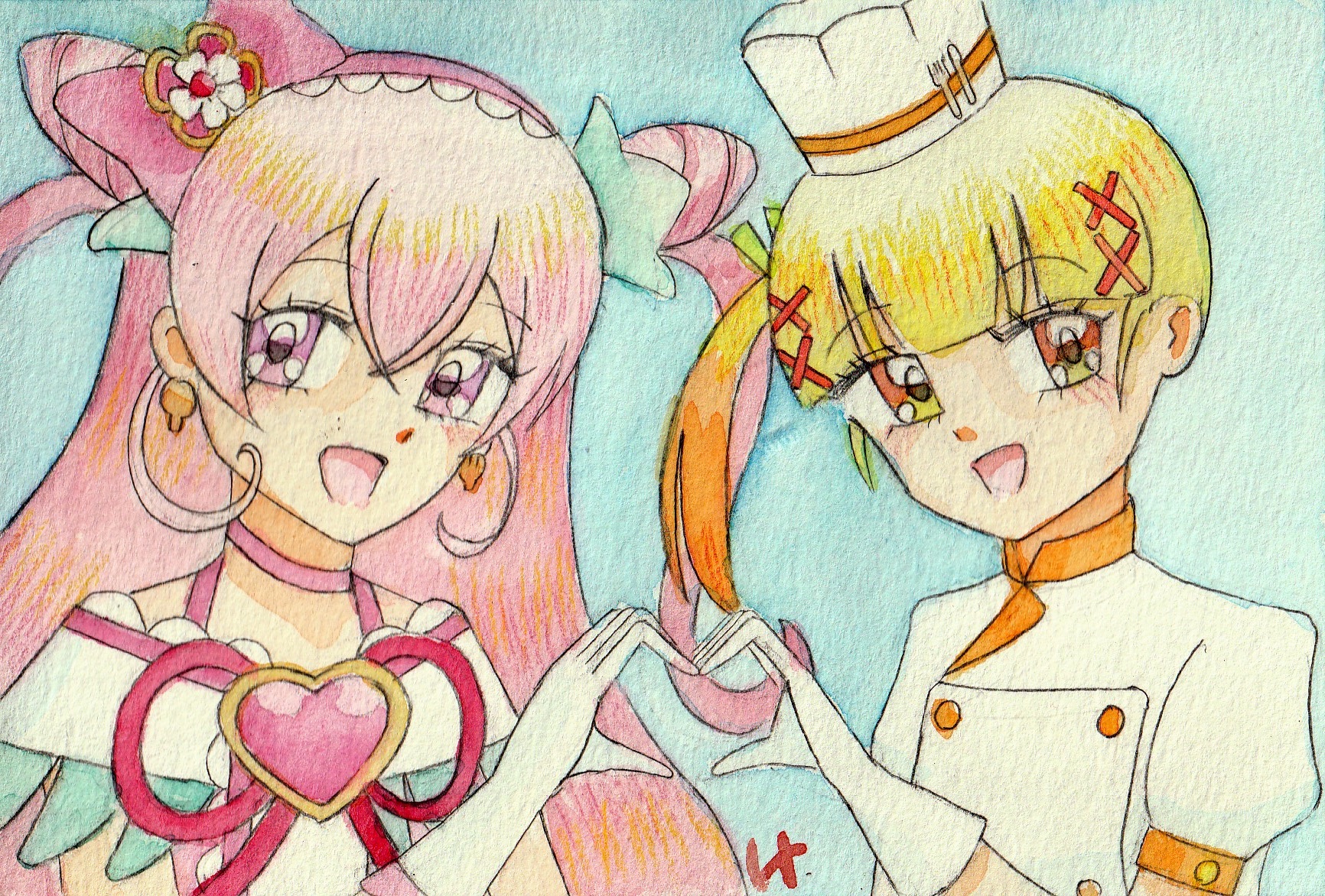 2girls blonde_hair cookpad-tan cure_precious delicious_party_precure highres multiple_girls naisen pink_hair precure