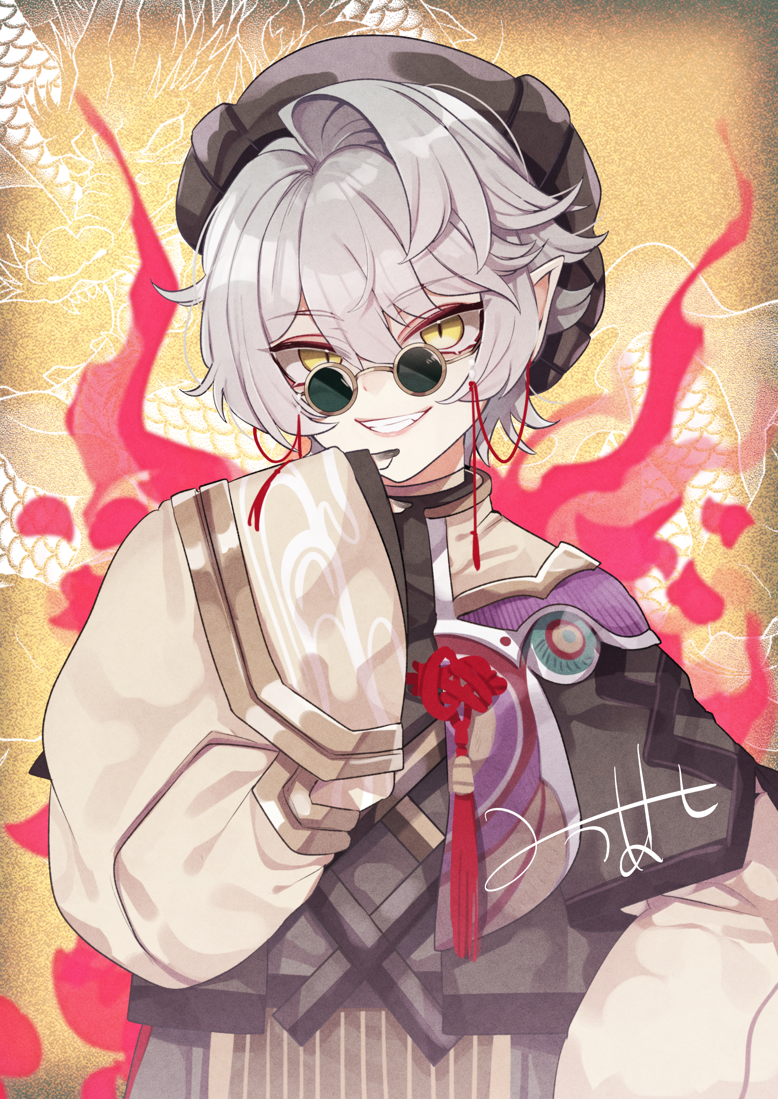 1boy absurdres antenna_hair bishounen black_nails chinese_clothes chinese_knot eyes_visible_through_hair facial_mark glasses hair_between_eyes hand_up hannya_(onmyoji) hat highres long_sleeves looking_at_viewer male_focus moto_mitsuashi nail_polish onmyoji pointy_ears round_eyewear short_hair slit_pupils smile solo string string_earrings trap white_hair wide_sleeves yellow_eyes