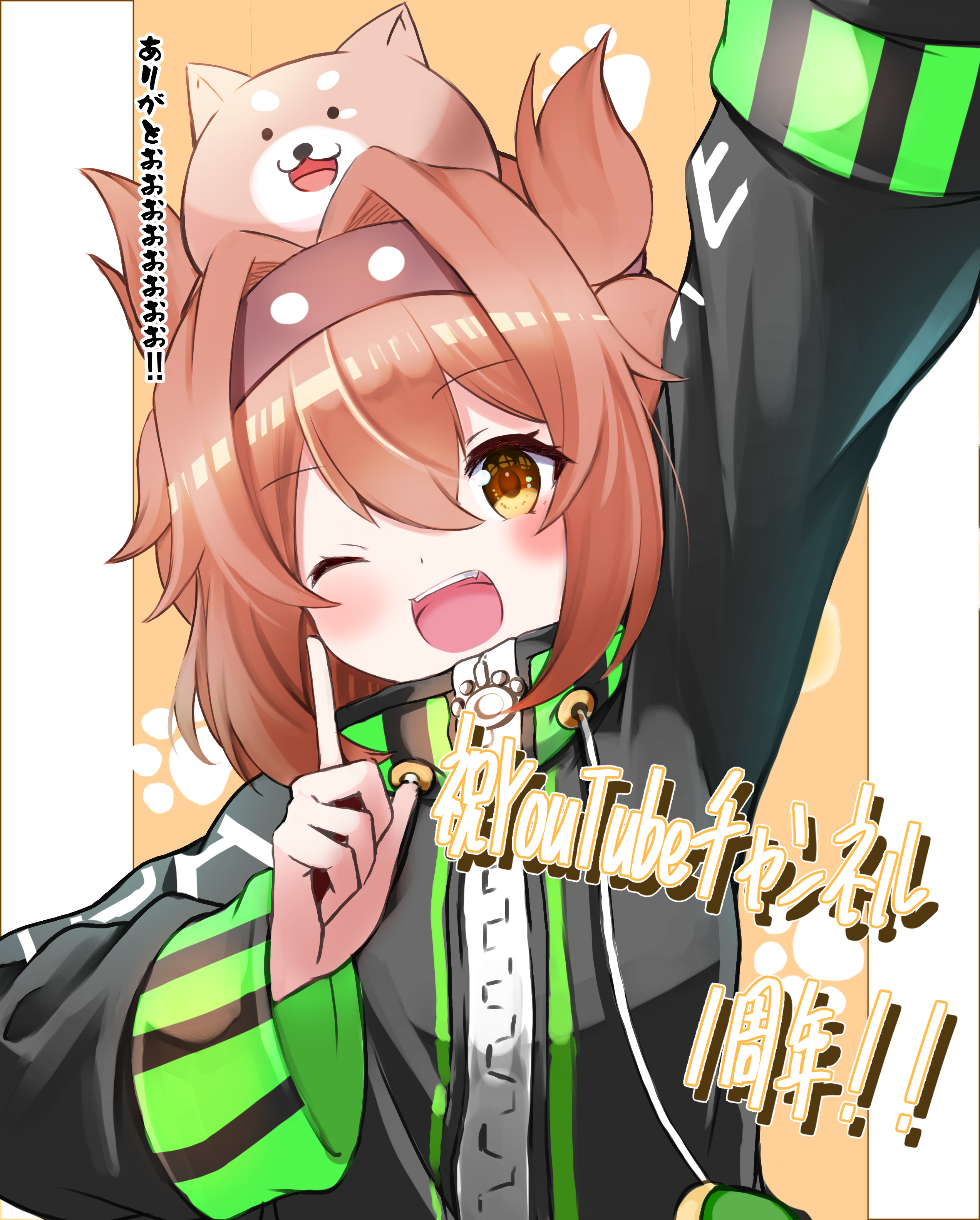 1girl ;d absurdres animal animal_on_head arm_up black_jacket blush brown_eyes brown_hair brown_hairband commentary_request dog drawstring hair_between_eyes hair_intakes hairband hand_up highres index_finger_raised jacket long_sleeves looking_at_viewer on_head one_eye_closed open_mouth original shibakame smile solo translation_request upper_body wide_sleeves