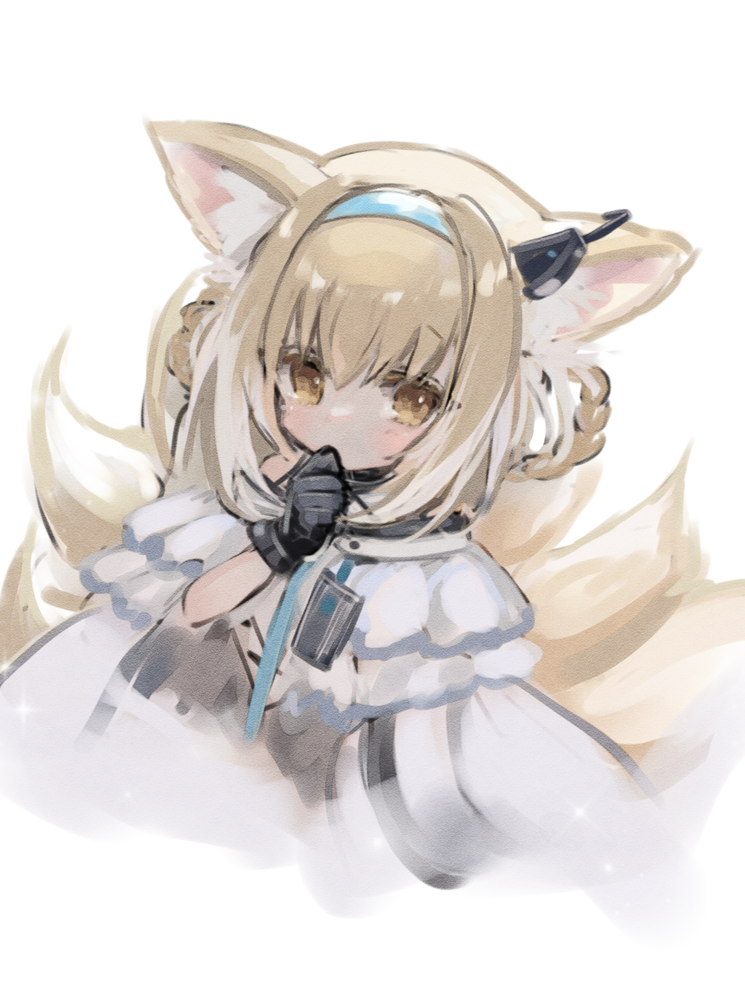 1girl 27vel animal_ears arknights black_gloves blonde_hair blue_hairband braid fox_ears fox_tail gloves hairband highres infection_monitor_(arknights) kitsune kyuubi long_hair multicolored_hair multiple_tails simple_background solo suzuran_(arknights) tail white_background white_hair yellow_eyes
