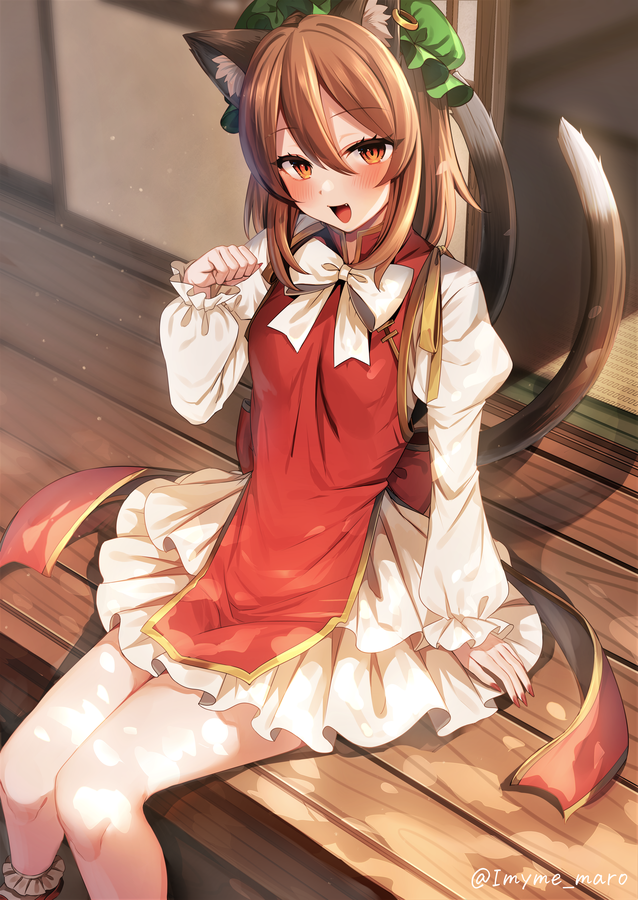 1girl animal_ears blush brown_eyes brown_hair cat_ears cat_tail chen earrings fang fingernails frilled_sleeves frills green_hat hair_between_eyes hat jewelry juliet_sleeves long_sleeves marota mob_cap multiple_tails nail_polish open_mouth puffy_sleeves red_nails sharp_fingernails short_hair single_earring sitting smile solo tail touhou twitter_username two_tails