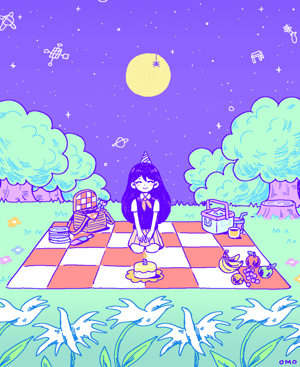 1girl animated animated_gif apple banana birthday_cake black_hair blanket blush cake candle car chicken_(food) closed_eyes closed_mouth cooler coral cup cupcake drinking_straw facing_viewer flower fog food forest fork fruit grapes grass ice ice_cube junkyard long_hair mari_(omori) moon motor_vehicle nature omocat omori orange_(fruit) outdoors picnic picnic_basket picnic_blanket plate seiza sitting sky smile snow solo spoilers star_(sky) starry_sky sushi tofu tree underwater