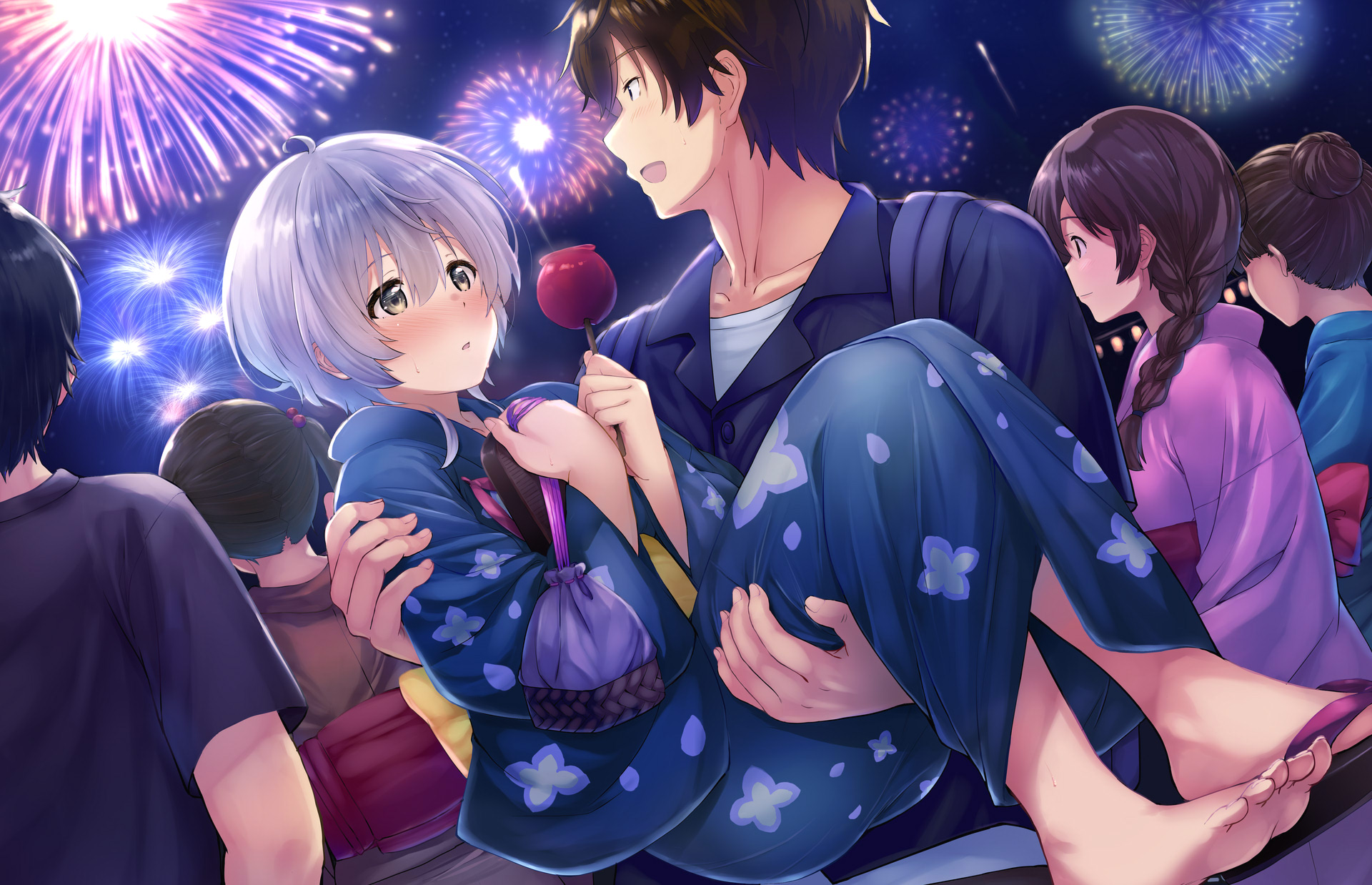 blush brown_hair candy_apple carrying fireworks food fumiya_tomozaki green_hair highres jaku-chara_tomozaki-kun japanese_clothes kikuchi_fuuka kimono nishiyama_maruta outdoors princess_carry short_hair yukata