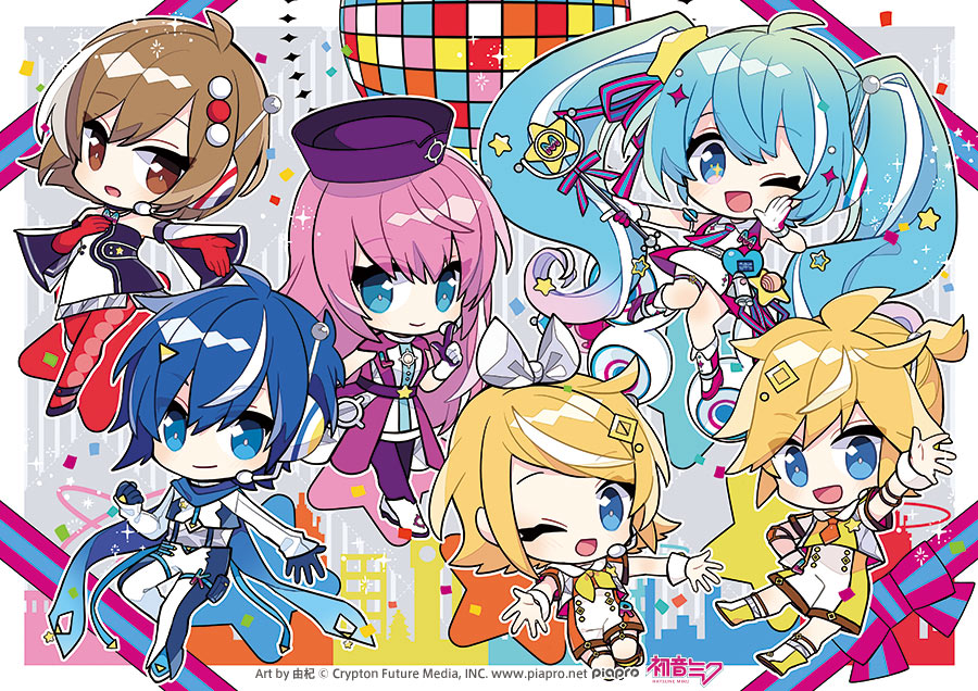 2boys 4girls absurdly_long_hair aqua_hair belt blonde_hair blue_bow blue_eyes blue_gloves blue_hair blue_necktie blue_ribbon boots bow brown_eyes brown_hair chibi clenched_hand closed_mouth collared_dress detached_sleeves dress flipped_hair floating gloves gradient_hair hair_bow hair_ornament hand_on_own_chest hat hatsune_miku headset heart high-low_skirt holding holding_wand index_finger_raised kagamine_len kagamine_rin kaito_(vocaloid) knee_boots knees_together_feet_apart long_hair looking_at_viewer magical_mirai_(vocaloid) magical_mirai_kaito magical_mirai_kaito_(2022) magical_mirai_len magical_mirai_len_(2022) magical_mirai_luka magical_mirai_luka_(2022) magical_mirai_meiko magical_mirai_meiko_(2022) magical_mirai_miku magical_mirai_miku_(2022) magical_mirai_rin magical_mirai_rin_(2022) medium_hair megurine_luka meiko_(vocaloid) microphone microphone_wand multicolored_eyes multicolored_hair multiple_boys multiple_girls neckerchief necktie official_art one_eye_closed open_mouth orange_bow outstretched_arm outstretched_arms pink_boots pink_bow pink_dress pink_eyes pink_gloves pink_hair pink_necktie pink_ribbon ponytail purple_dress purple_gloves purple_headwear radio_antenna reaching reaching_towards_viewer red_gloves ribbon rocket_ship second-party_source short_ponytail sidelocks sleeveless sleeveless_dress smile spacecraft standing star-shaped_pupils star_(symbol) star_hair_ornament streaked_hair symbol-shaped_pupils thigh_strap twintails two-tone_bow two-tone_gloves two-tone_necktie two-tone_ribbon very_long_hair vocaloid wand white_bow white_dress white_footwear white_gloves white_hair wrist_cuffs yellow_neckerchief yoshiki