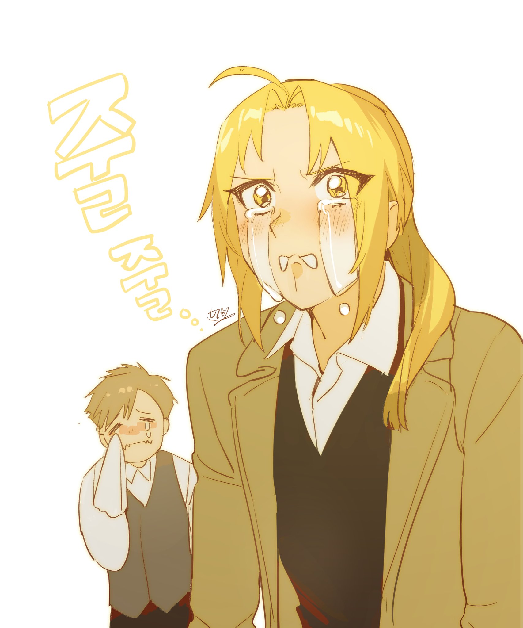 2boys =_= ahoge alphonse_elric blush brothers brown_hair closed_mouth coat collared_shirt crying crying_with_eyes_open edward_elric fangs fullmetal_alchemist happy happy_tears highres long_sleeves male_focus multiple_boys paldu parted_bangs ponytail shirt siblings simple_background skin_fangs streaming_tears tears translation_request upper_body vest white_background wiping_tears yellow_eyes