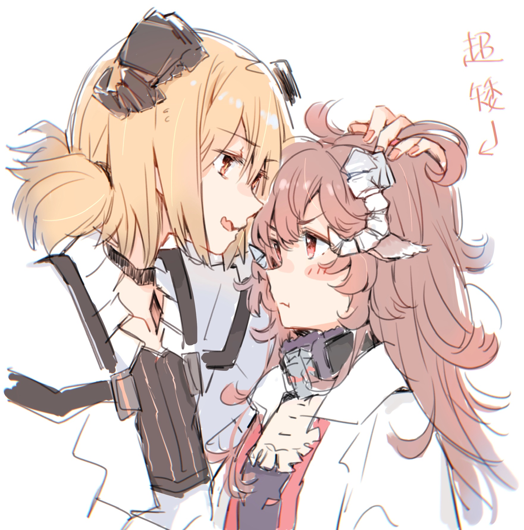 2girls :t animal_ears arknights black_choker black_dress blonde_hair blush brown_hair chinese_text choker demon_girl demon_horns dress eyjafjalla_(arknights) fang feather_choker hair_between_eyes hand_in_another's_hair headpat height_difference highres horns ifrit_(arknights) jacket lionet0806 long_hair mask mask_around_neck multiple_girls open_clothes open_jacket open_mouth orange_eyes pout purple_dress red_eyes sheep_ears sheep_girl sheep_horns short_hair short_twintails simple_background skin_fang translation_request twintails upper_body white_background white_jacket